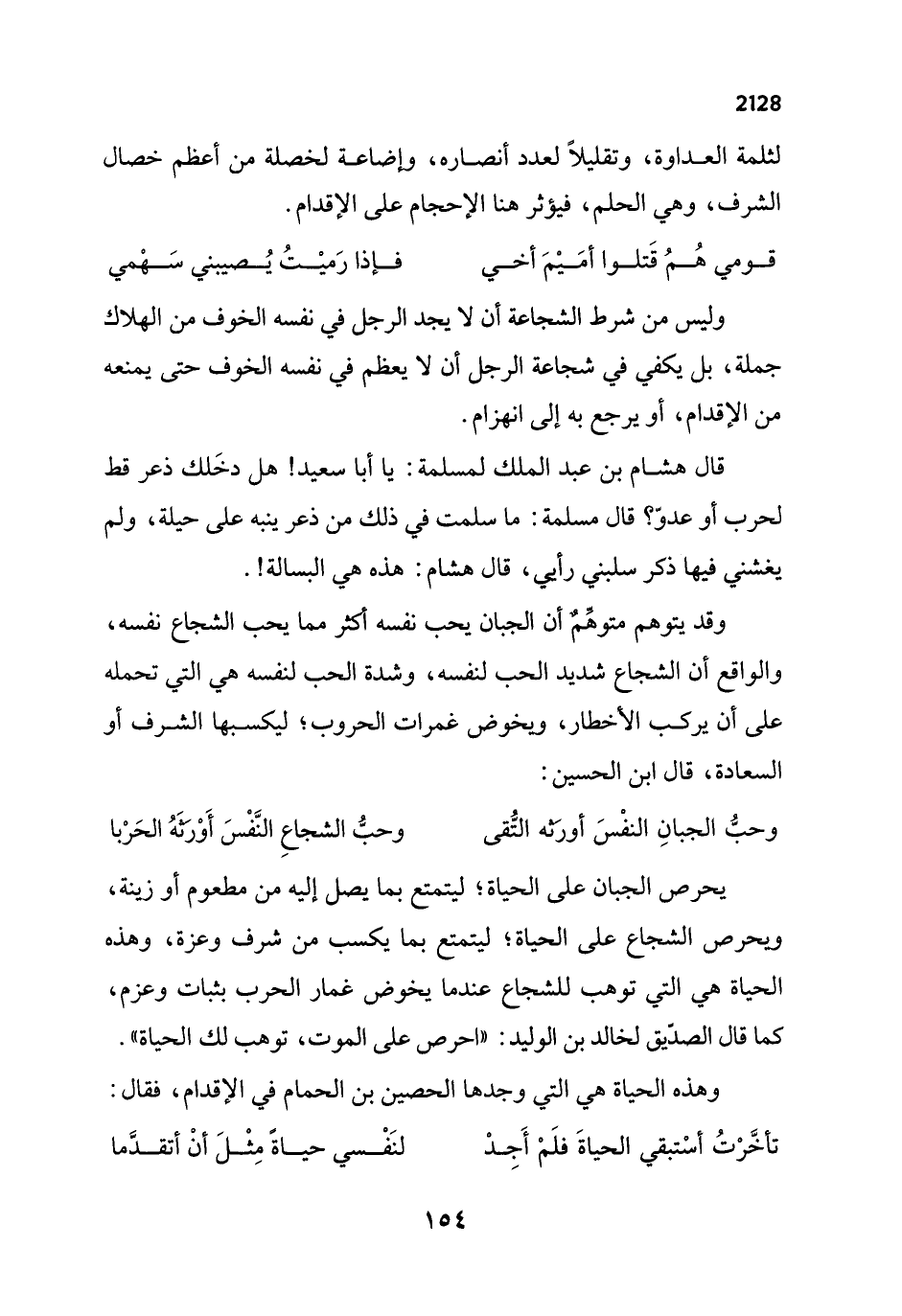 وقد يتوهم متوهِّم أن الجبان يحب نفسه أكثر مما يحب الشجاع نفسه، والواقع أن الشجاع شديد الحب لنفسه، وشدة الحب لنفسه هي التي تحمله على أن يركب الأخطار، ويخوض غمرات الحروب؛ ليكسبها الشرف أو السعادة، قال ابن الحسين: