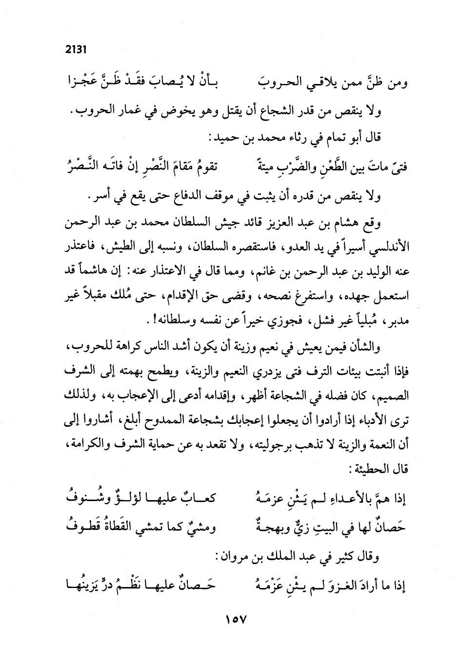 والشأن فيمن يعيش في نعيم وزينة أن يكون أشد الناس كراهة للحروب، فإذا أنبتت بيئات الترف فتى يزدري النعيم والزينة، ويطمح بهمته إلى الشرف الصميم، كان فضله في الشجاعة أظهر، وإقدامه أدعى إلى الإعجاب به، ولذلك ترى الأدباء إذا أرادوا أن يجعلوا إعجابك بشجاعة الممدوح أبلغ، أشاروا إلى أن النعمة والزينة لا تذهب برجوليته، ولا تقعد به عن حماية الشرف والكرامة، قال الحطيئة: