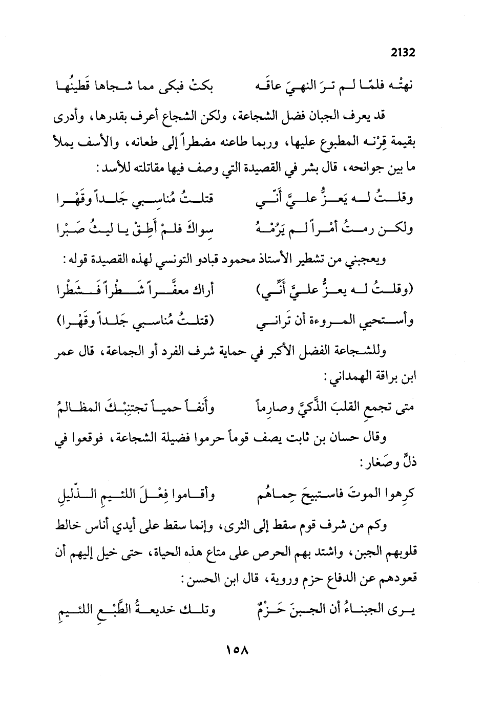 قد يعرف الجبان فضل الشجاعة، ولكن الشجاع أعرف بقدرها، وأدرى بقيمة قِرْنه المطبوع عليها، وربما طاعنه مضطرًا إلى طعانه، والأسف يملأ ما بين جوانحه، قال بشر في القصيدة التي وصف فيها مقاتلته للأسد: