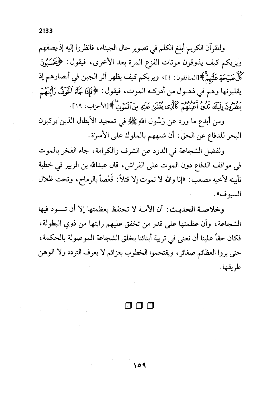 وخلاصة الحديث: أن الأمة لا تحتفظ بعظمتها إلا أن تسود فيها الشجاعة، وأن عظمتها على قدر من تخفق عليهم رايتها من ذوي البطولة، فكان حقاً علينا أن نعنى في تربية أبنائنا بخلق الشجاعة الموصولة بالحكمة، حتى يروا العظائم صغائر، ويقتحموا الخطوب بعزائم لا يعرف التردد ولا الوهن طريقها.