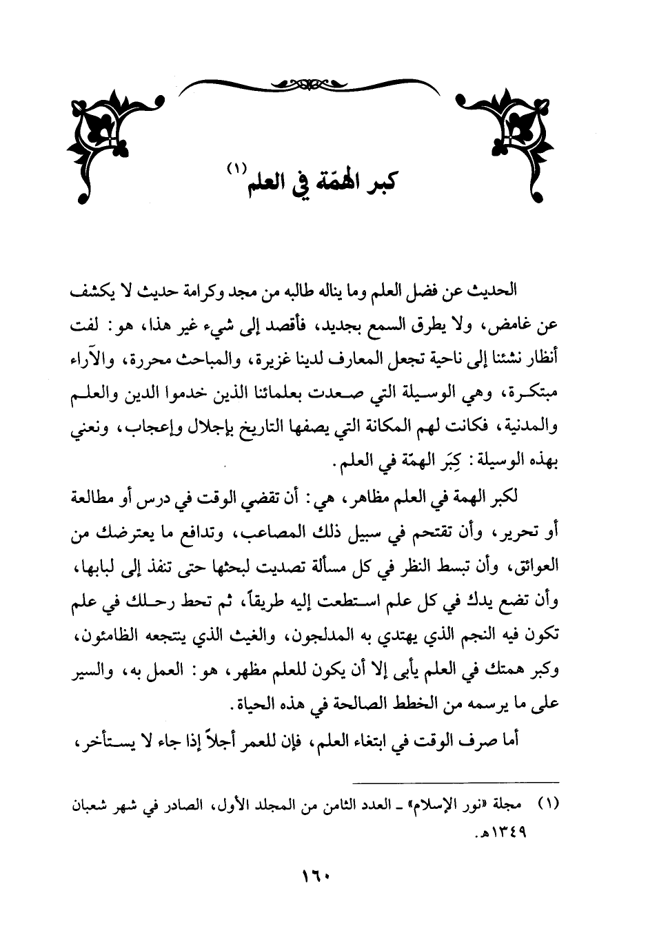 ل كبر الهمة في العلم مظاهر، هي: أن تقضي الوقت في درس أو مطالعة أو تحرير، وأن تقتحم في سبيل ذلك المصاعب، وتدافع ما يعترضك من العوائق، وأن تبسط النظر في كل مسألة تصديت لبحثها حتى تنفذ إلى لبابها، وأن تضع يدك في كل علم استطعت إليه طريقاً، ثم تحط رحلك في علم تكون فيه النجم الذي يهتدي به المدلجون، والغيث الذي ينتجعه الظامئون، وكبر همتك في العلم يأبى إلا أن يكون للعلم مظهر، هو: العمل به، والسير على ما يرسمه من الخطط الصالحة في هذه الحياة.