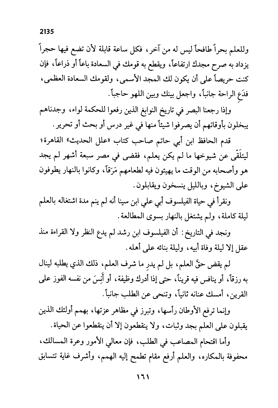 وللعلم بحراً طافحاً ليس له من آخر، فكل ساعة قابلة لأن تضع فيها حجراً يزداد به صرح مجدك ارتفاعاً، ويقطع به قومك في السعادة باعاً أو ذراعاً، فإن كنت حريصاً على أن يكون لك المجد الأسمى، ولقومك السعادة العظمى، فدَعِ الراحة جانباً، واجعل بينك وبين اللهو حاجباً.