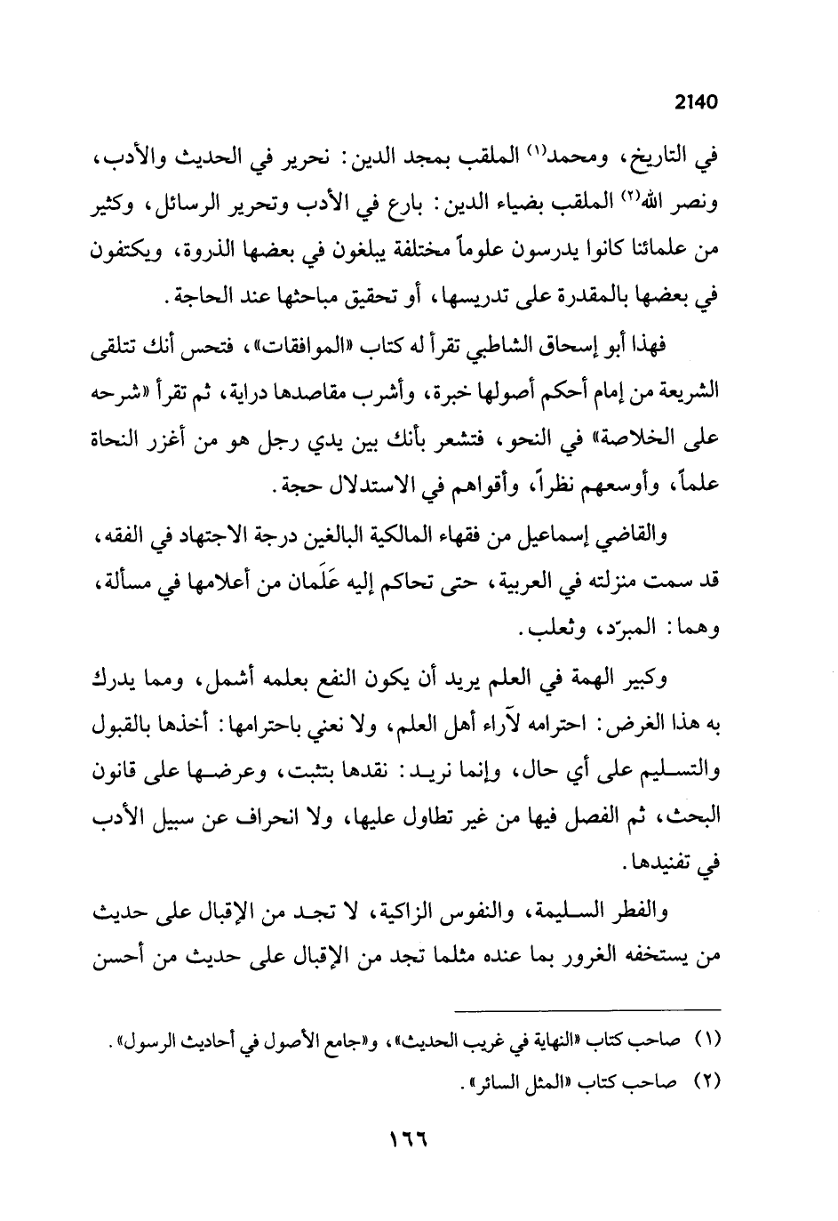 في التاريخ، ومحمد (¬1) الملقب بمجد الدين: نحرير في الحديث والأدب، ونصر الله (¬2) الملقب بضياء الدين: بارع في الأدب وتحرير الرسائل، وكثير من علمائنا كانوا يدرسون علومًا مختلفة يبلغون في بعضها الذروة، ويكتفون في بعضها بالمقدرة على تدريسها، أو تحقيق مباحثها عند الحاجة.