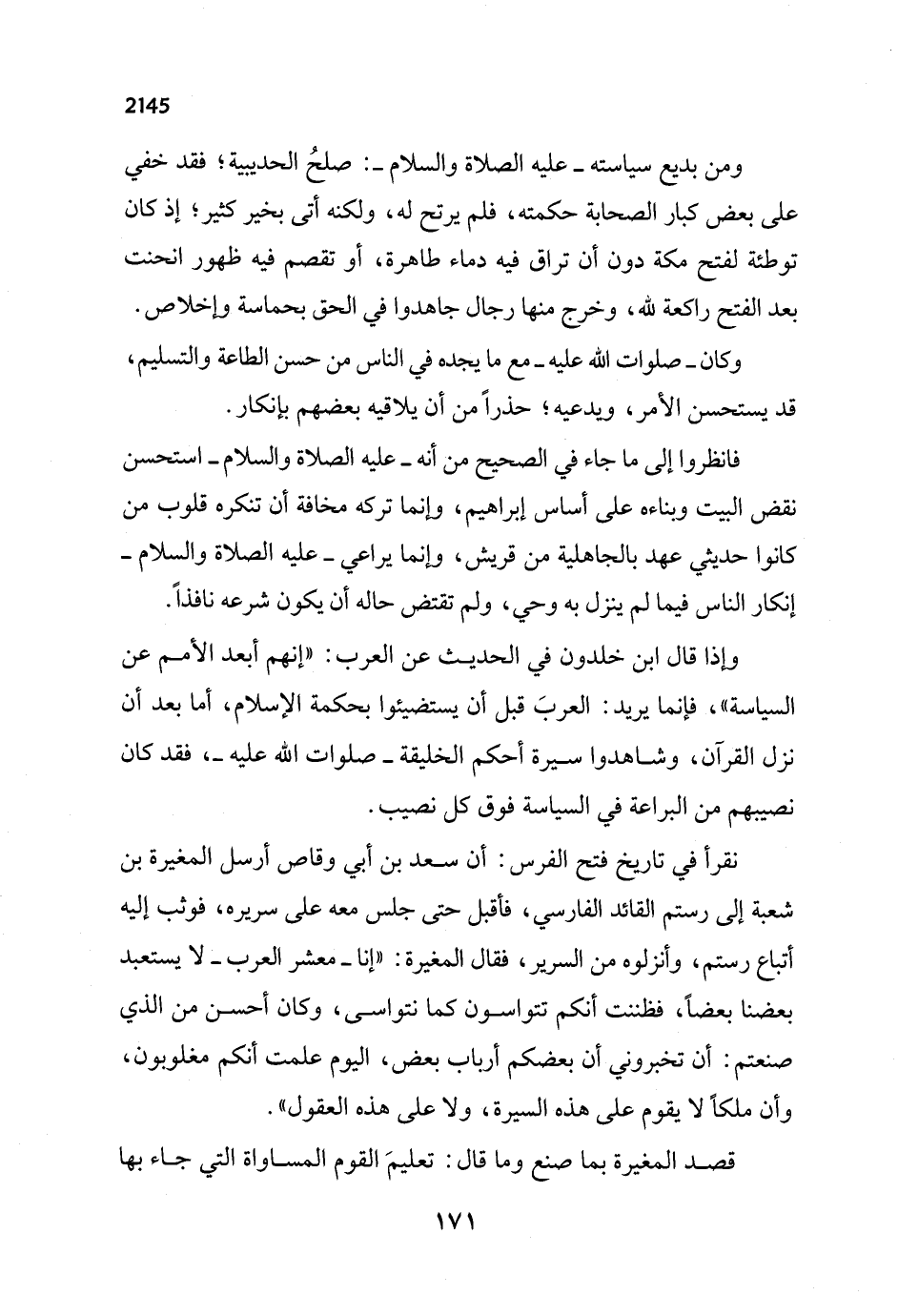وإذا قال ابن خلدون في الحديث عن العرب: "إنهم أبعد الأمم عن السياسة"، فإنما يريد: العربَ قبل أن يستضيئوا بحكمة الإسلام، أما بعد أن نزل القرآن، وشاهدوا سيرة أحكم الخليقة - صلوات الله عليه -، فقد كان نصيبهم من البراعة في السياسة فوق كل نصيب.