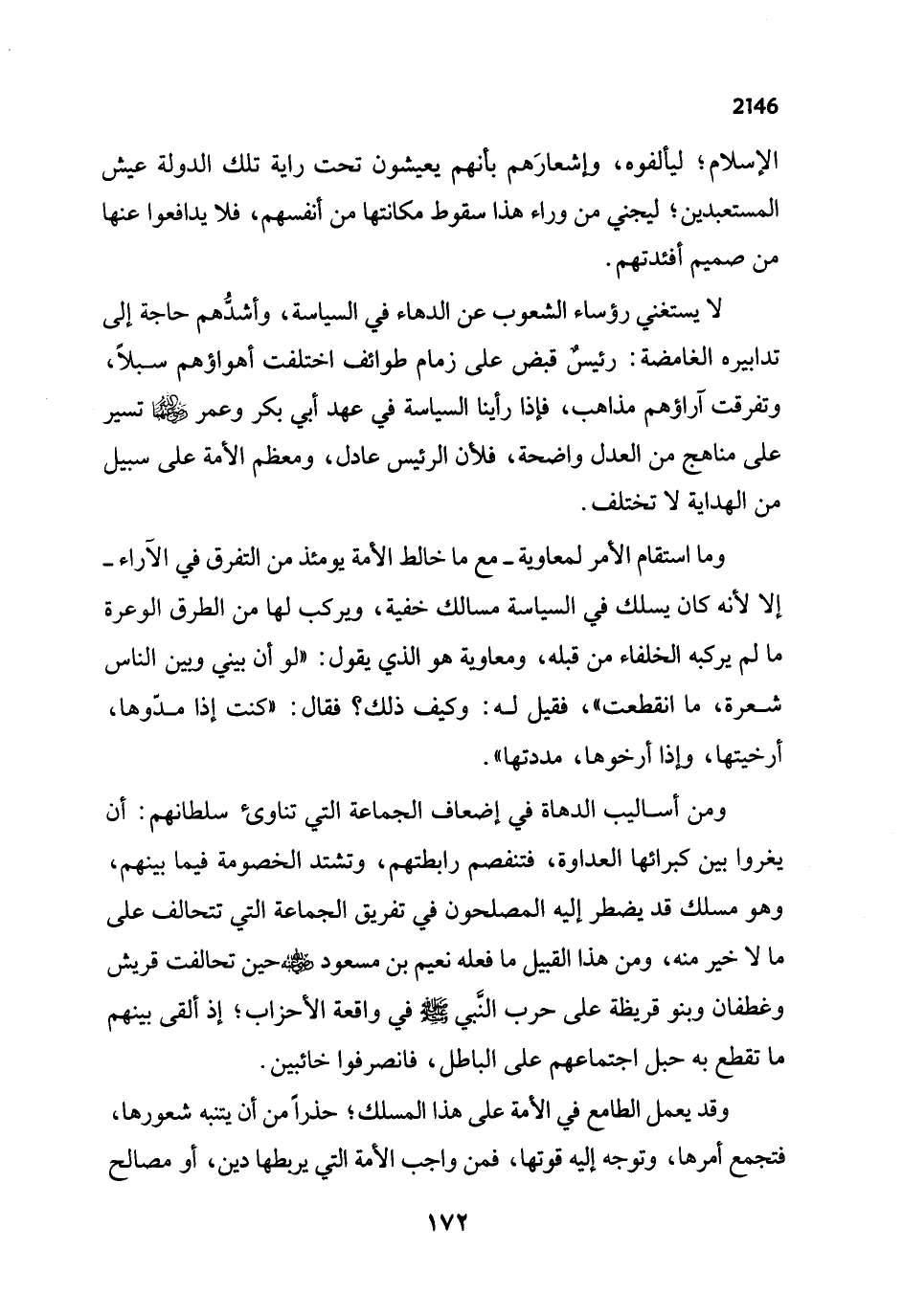 لا يستغني رؤساء الشعوب عن الدهاء في السياسة، وأشدُّهم حاجة إلى تدابيره الغامضة: رئيسٌ قبض على زمام طوائف اختلفت أهواؤهم سبلاً، وتفرقت آراؤهم مذاهب، فإذا رأينا السياسة في عهد أبي بكر وعمر - رضي الله عنهما - تسير على مناهج من العدل واضحة، فلأن الرئيس عادل، ومعظم الأمة على سبيل من الهداية لا تختلف.