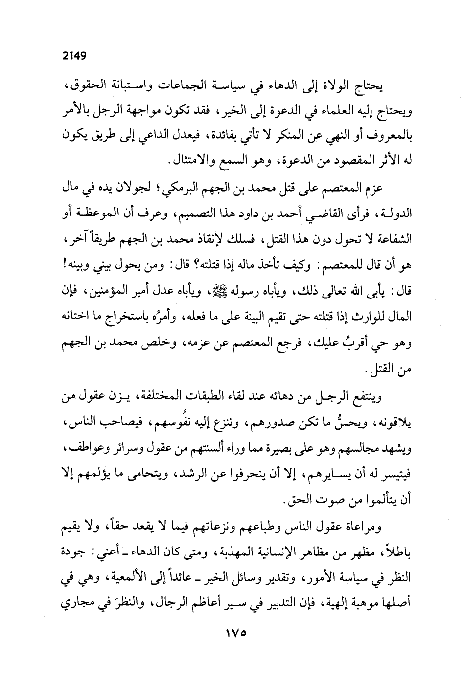 ومراعاة عقول الناس وطباعهم ونزعاتهم فيما لا يقعد حقاً، ولا يقيم باطلاً، مظهر من مظاهر الإنسانية المهذبة، ومتى كان الدهاء - أعني: جودة النظر في سياسة الأمور، وتقدير وسائل الخير - عائداً إلى الألمعية، وهي في أصلها موهبة إلهية، فإن التدبير في سير أعاظم الرجال، والنظرَ في مجاري