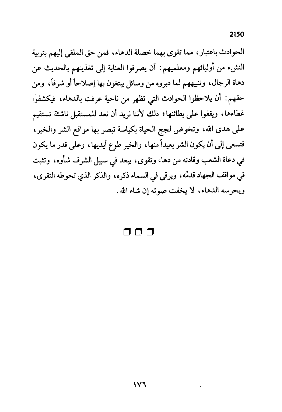 الحوادث باعتبار، مما تقوى بهما خصلة الدهاء، فمن حق الملقى إليهم بتربية النشء من أوليائهم ومعلميهم: أن يصرفوا العناية إلى تغذيتهم بالحديث عن دهاة الرجال، وتنبيههم لما دبروه من وسائل يبتغون بها إصلاحاً أو شرفاً، ومن حقهم: أن يلاحظوا الحوادث التي تظهر من ناحية عرفت بالدهاء، فيكشفوا غطاءها، ويقفوا على بطائنها؛ ذلك لأننا نريد أن نعد للمستقبل ناشئة تستقيم على هدى الله، وتخوض لجج الحياة بكياسة تبصر بها مواقع الشر والخير، فتسعى إلى أن يكون الشر بعيداً منها، والخير طوع أيديها، وعلى قدر ما يكون في دعاة الشعب وقادته من دهاء وتقوى، يبعد في سبيل الشرف شاوه، وتثبت في مواقف الجهاد قدمُه، ويرقى في السماء ذكره، والذكر الذي تحوطه التقوى، ويحرسه الدهاء، لا يخفت صوته إن شاء الله.
