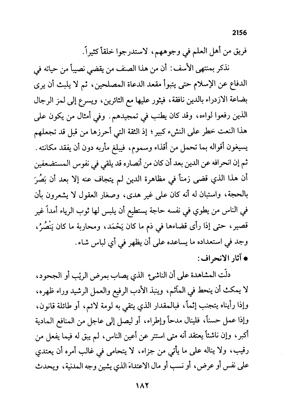 نذكر بمنتهى الأسف: أن من هذا الصنف من يقضي نصيباً من حياته في الدفاع عن الإسلام حتى يتبوأ مقعد الدعاة المصلحين، ثم لا يلبث أن يرى بضاعة الازدراء بالدين نافقة، فيثور عليها مع الثائرين، ويسرع إلى لمز الرجال الذين رفعوا لواءه، وقد كان يطنب في تمجيدهم. وفي أمثال من يكون على هذا النعت خطر على النشء كبير؛ إذ الثقة التي أحرزها من قبل قد تجعلهم يسيغون أقواله بما تحمل من أقذاء وسموم، فيبلغ مأربه دون أن يفقد مكانته. ثم إن انحرافه عن الدين بعد أن كان من أنصاره قد يلقي في نفوس المستضعفين أن هذا الذي قضى زمناً في مظاهرة الدين لم يتجاف عنه إلا بعد أن بَصُرَ بالحجة، واستبان له أنه كان على غير هدى، وصغار العقول لا يشعرون بأن في الناس من يطوي في نفسه حاجة يستطيع أن يلبس لها ثوب الرياء أمدًا غير قصير، حتى إذا رأى قضاءها في ذم ما كان يَحْمَد، ومحاربة ما كان يَنْصُرُ، وجد في استعداده ما يساعده على أن يظهر في أي لباس شاء.