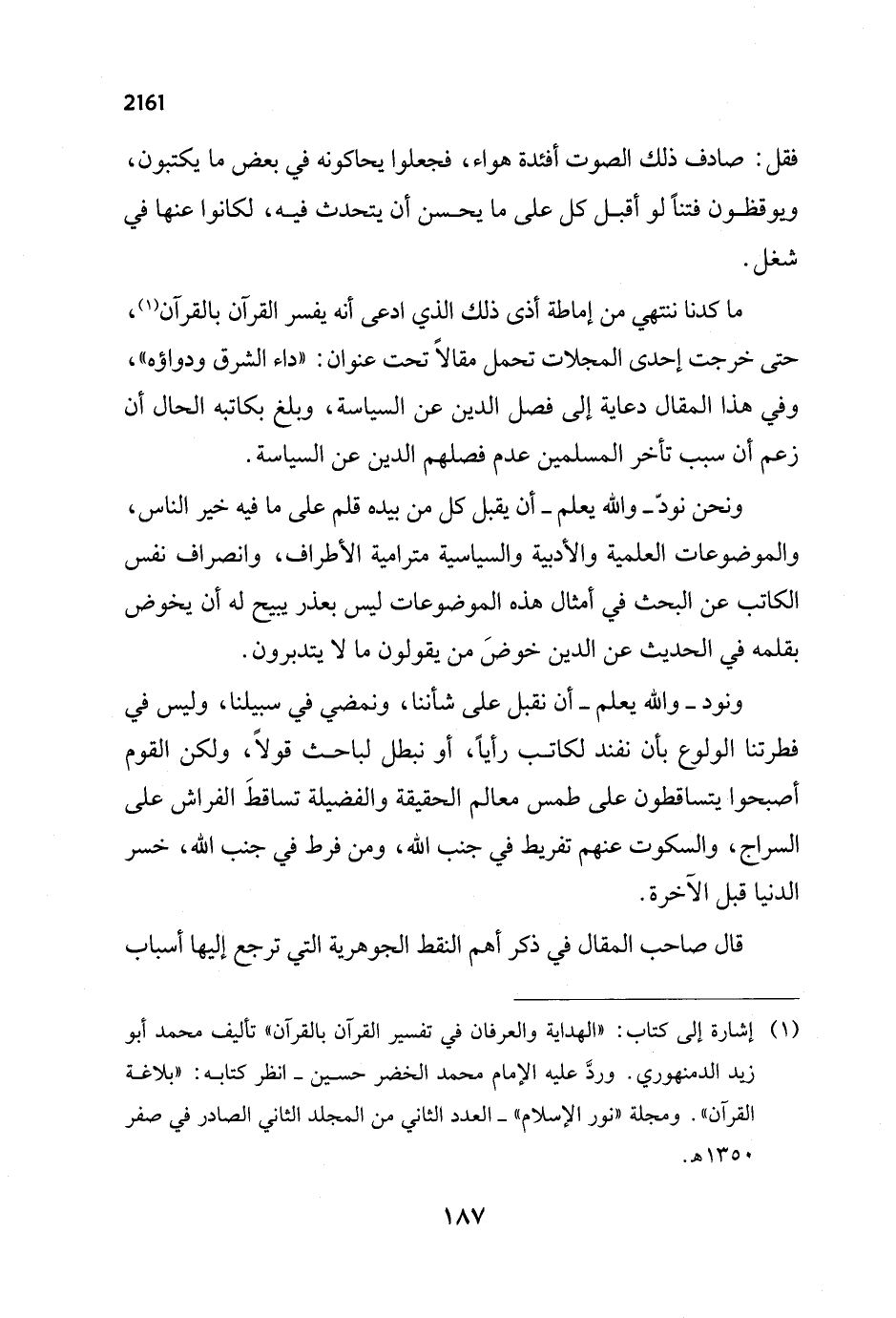 (¬1) إشارة إلى كتاب: "الهداية والعرفان في تفسير القرآن بالقرآن" تأليف محمد أبو زيد الدمنهوري. وردَّ عليه الإمام محمد الخضر حسين -انظر كتابه: "بلاغة القرآن". ومجلة "نور الإسلام" - العدد الثاني من المجلد الثاني الصادر في صفر 1350 هـ.
