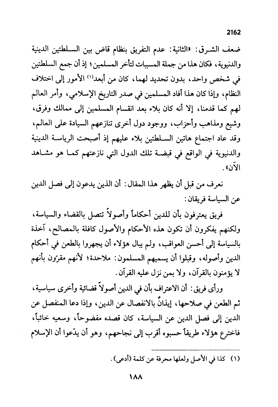 ضعف الشرق: "الثانية: عدم التفريق بنظام قاض بين السلطتين الدينية والدنيوية، فكان هذا من جملة المسببات لتأخر المسلمين؛ إذ أن جمع السلطتين في شخص واحد، بدون تحديد لهما، كان من أبعد (¬1) الأمور إلى اختلاف النظام، وإذا كان هذا أفاد المسلمين في صدر التاريخ الإسلامي، وأمر العالم لهم كما قدمنا، إلا أنه كان بلاء بعد انقسام المسلمين إلى ممالك وفرق، وشيع ومذاهب وأحزاب، ووجود دول أخرى تنازعهم السيادة على العالم، وقد عاد اجتماع هاتين السلطتين بلاء عليهم إذ أصبحت الرياسة الدينية والدنيوية في الواقع في قبضة تلك الدول التي نازعتهم كما هو مشاهد الآن".