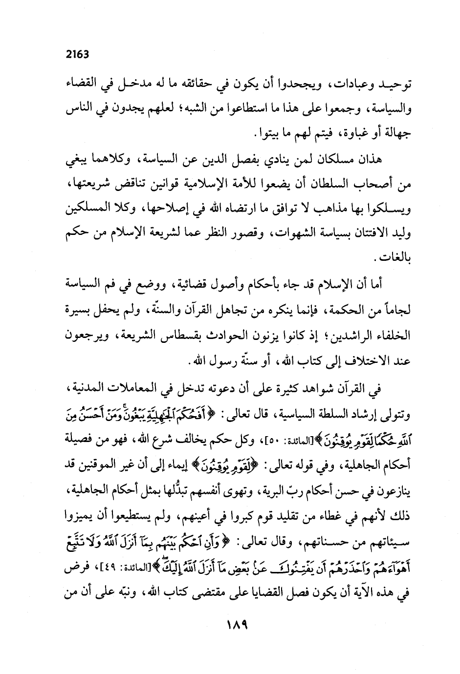 في القرآن شواهد كثيرة على أن دعوته تدخل في المعاملات المدنية، وتتولى إرشاد السلطة السياسية، قال تعالى: {أَفَحُكْمَ الْجَاهِلِيَّةِ يَبْغُونَ وَمَنْ أَحْسَنُ مِنَ اللَّهِ حُكْمًا لِقَوْمٍ يُوقِنُونَ} [المائدة: 50]، وكل حكم يخالف شرع الله، فهو من فصيلة أحكام الجاهلية، وفي قوله تعالى: {لِقَوْمٍ يُوقِنُونَ} إيماء إلى أن غير الموقنين قد ينازعون في حسن أحكام ربّ البرية، وتهوى أنفسهم تبدُّلها بمثل أحكام الجاهلية، ذلك لأنهم في غطاء من تقليد قوم كبروا في أعينهم، ولم يستطيعوا أن يميزوا سيئاتهم من حسناتهم، وقال تعالى: {وَأَنِ احْكُمْ بَيْنَهُمْ بِمَا أَنْزَلَ اللَّهُ وَلَا تَتَّبِعْ أَهْوَاءَهُمْ وَاحْذَرْهُمْ أَنْ يَفْتِنُوكَ عَنْ بَعْضِ مَا أَنْزَلَ اللَّهُ إِلَيْكَ} [المائدة: 49]، فرض في هذه الآية أن يكون فصل القضايا على مقتضى كتاب الله، ونبّه على أن من