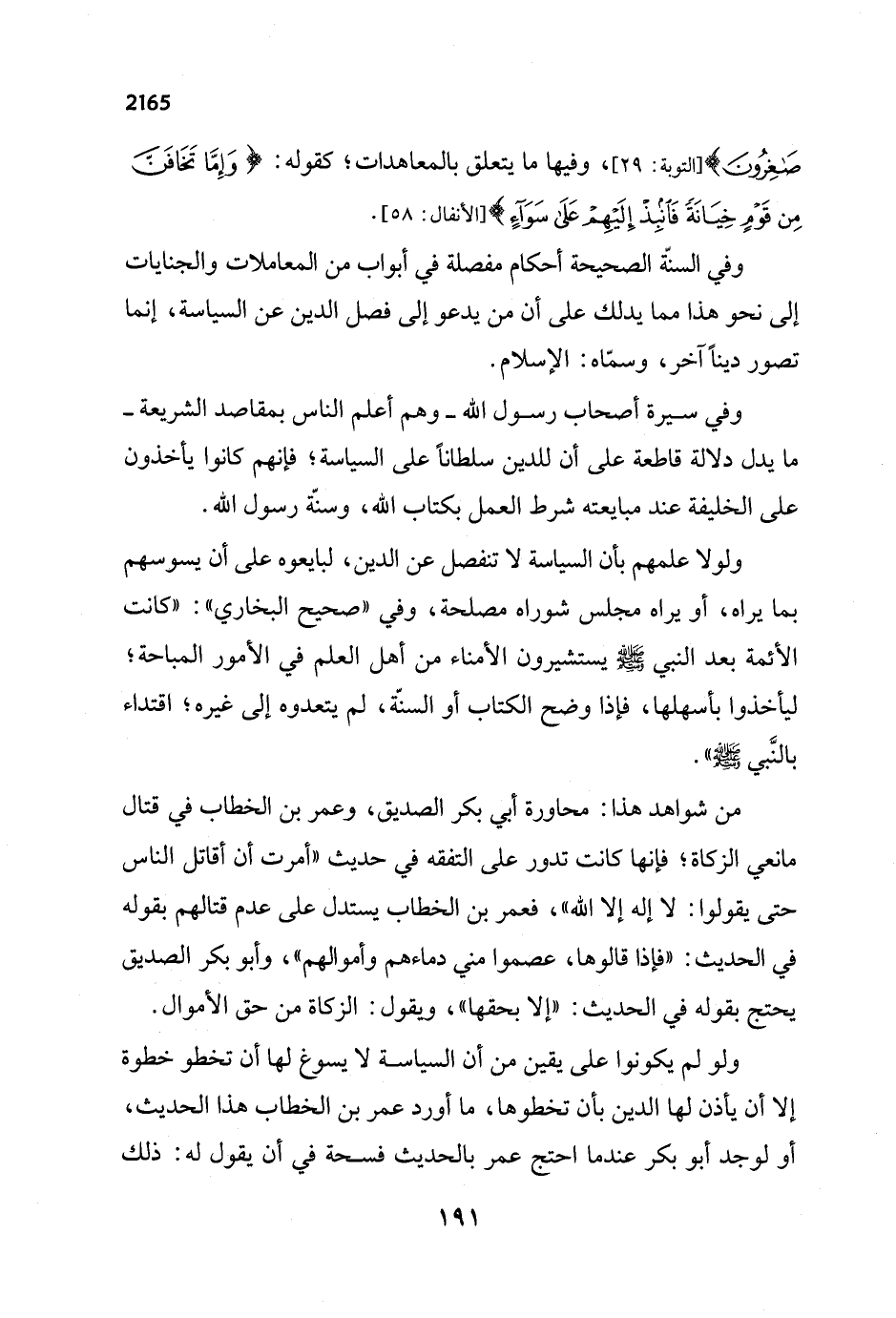 ولو لم يكونوا على يقين من أن السياسة لا يسوغ لها أن تخطو خطوة إلا أن يأذن لها الدين بأن تخطوها، ما أورد عمر بن الخطاب هذا الحديث، أو لوجد أبو بكر عندما احتج عمر بالحديث فسحة في أن يقول له: ذلك