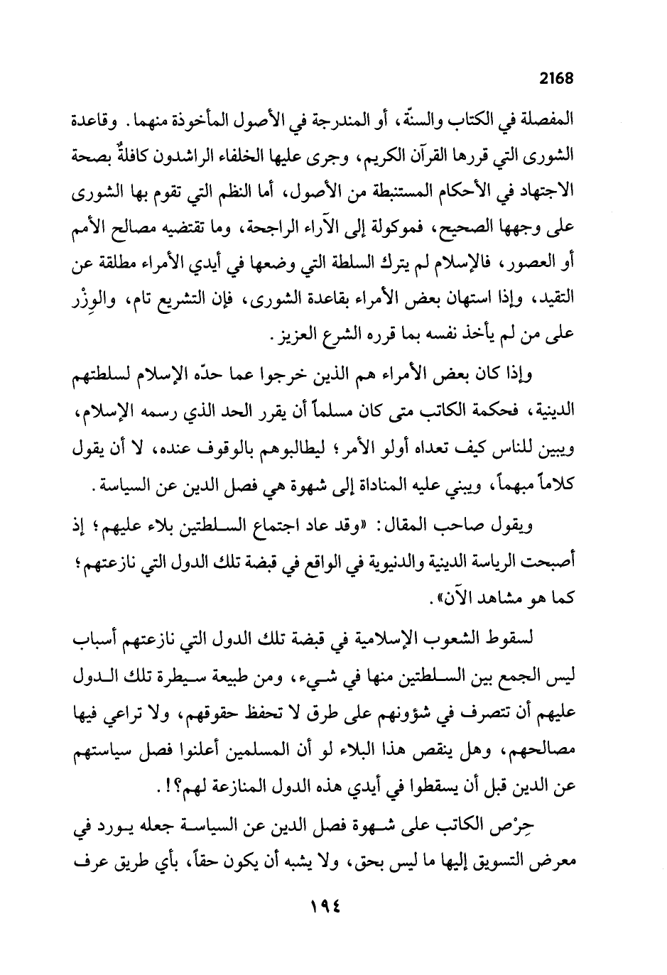 وإذا كان بعض الأمراء هم الذين خرجوا عما حده الإسلام لسلطتهم الدينية، فحكمة الكاتب متى كان مسلمًا أن يقرر الحد الذي رسمه الإسلام، ويبين للناس كيف تعداه أولو الأمر؛ ليطالبوهم بالوقوف عنده، لا أن يقول كلاماً مبهماً، ويبني عليه المناداة إلى شهوة هي فصل الدين عن السياسة.