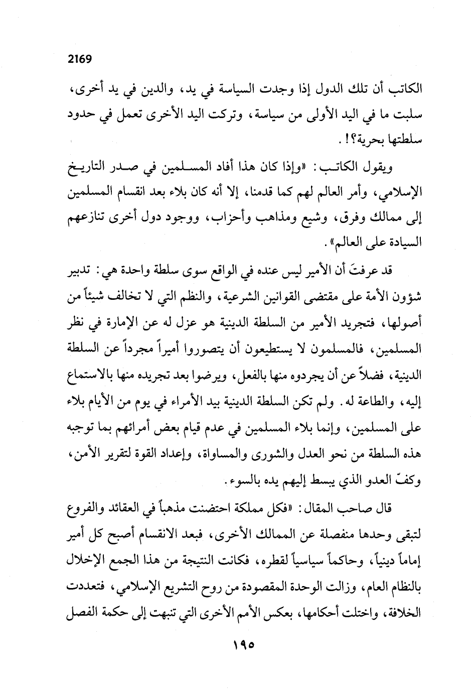 الكاتب أن تلك الدول إذا وجدت السياسة في يد، والدين في يد أخرى، سلبت ما في اليد الأولى من سياسة، وتركت اليد الأخرى تعمل في حدود سلطتها بحرية؟!.