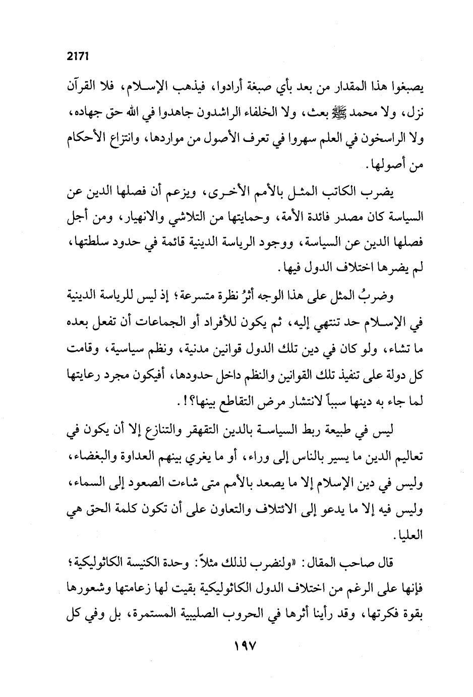 وضربُ المثل على هذا الوجه أثرُ نظرة متسرعة؛ إذ ليس للرياسة الدينية في الإسلام حد تنتهي إليه، ثم يكون للأفراد أو الجماعات أن تفعل بعده ما تشاء، ولو كان في دين تلك الدول قوانين مدنية، ونظم سياسية، وقامت كل دولة على تنفيذ تلك القوانين والنظم داخل حدودها، أفيكون مجرد رعايتها لما جاء به دينها سبباً لانتشارمرض التقاطع بينها؟!.