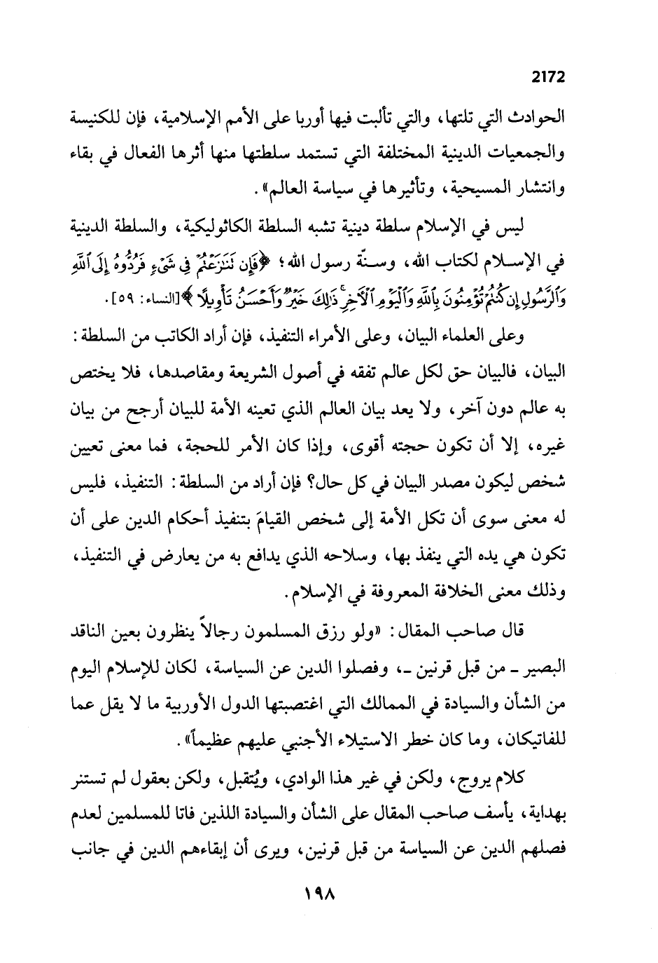 وعلى العلماء البيان، وعلى الأمراء التنفيذ، فإن أراد الكاتب من السلطة: البيان، فالبيان حق لكل عالم تفقه في أصول الشريعة ومقاصدها، فلا يختص به عالم دون آخر، ولا يعد بيان العالم الذي تعينه الأمة للبيان أرجح من بيان غيره، إلا أن تكون حجته أقوى، وإذا كان الأمر للحجة، فما معنى تعيين شخص ليكون مصدر البيان في كل حال؟ فإن أراد من السلطة: التنفيذ، فليس له معنى سوى أن تأكل الأمة إلى شخص القيامَ بتنفيذ أحكام الدين على أن تكون هي يده التي ينفذ بها، وسلاحه الذي يدافع به من يعارض في التنفيذ، وذلك معنى الخلافة المعروفة في الإسلام.