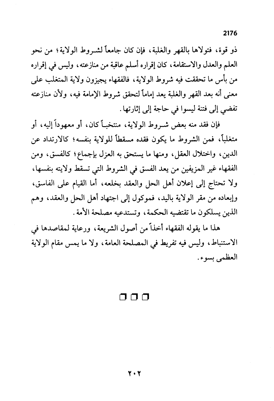 فإن فقد منه بعض شروط الولاية، منتخباً كان، أو معهوداً إليه، أو متغلباً، فمن الشروط ما يكون فقده مسقطًا للولاية بنفسه؛ كالارتداد عن الدين، واختلال العقل، ومنها ما يستحق به العزل لإجماع؛ كالفسق، ومن الفقهاء غير المزيفين من يعد الفسق في الشروط التي تسقط ولايته بنفسها، ولا تحتاج إلى إعلان أهل الحل والعقد بخلعه، أما القيام على الفاسق، وإبعاده من مقر الولاية باليد، فموكول إلى اجتهاد أهل الحل والعقد، وهم الذين يسلكون ما تقتضيه الحكمة، وتستدعيه مصلحة الأمة.