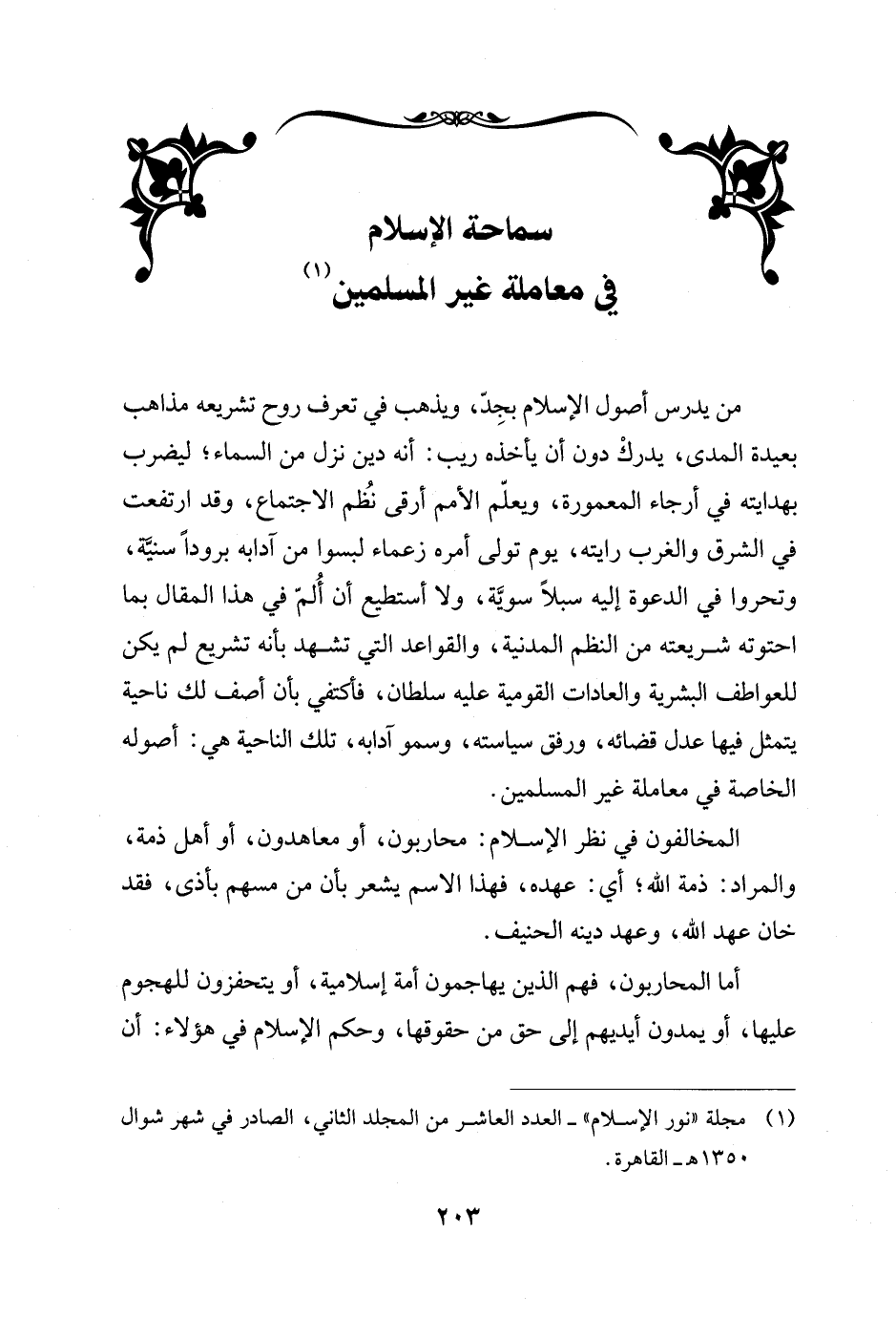 من يدرس أصول الإِسلام بجِدّ، ويذهب في تعرف روح تشريعه مذاهب بعيدة المدى، يدرك دون أن يأخذه ريب: أنه دين نزل من السماء؛ ليضرب بهدايته في أرجاء المعمورة، ويعلّم الأمم أرقى نظُم الاجتماع، وقد ارتفعت في الشرق والغرب رايته، يوم تولى أمره زعماء لبسوا من آدابه برودًا سنيَّة، وتحروا في الدعوة إليه سبلاً سويَّة، ولا أستطيع أن أُلمّ في هذا المقال بما احتوته شريعته من النظم المدنية، والقواعد التي تشهد بأنه تشريع لم يكن للعواطف البشرية والعادات القومية عليه سلطان، فأكتفي بأن أصف لك ناحية يتمثل فيها عدل قضائه، ورفق سياسته، وسمو آدابه، تلك الناحية هي: أصوله الخاصة في معاملة غير المسلمين.