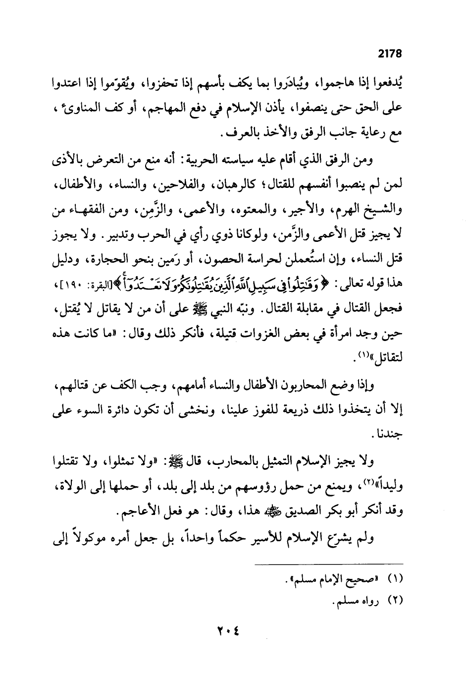 ومن الرفق الذي أقام عليه سياسته الحربية: أنه منع من التعرض بالأذى لمن لم ينصبوا أنفسهم للقتال؛ كالرهبان، والفلاحين، والنساء، والأطفال، والشيخ الهرم، والأجير، والمعتوه، والأعمى، والزَّمِن، ومن الفقهاء من لا يجيز قتل الأعمى والزَّمن، ولو كانا ذوي رأي في الحرب وتدبير. ولا يجوز قتل النساء، وإن استُعملن لحراسة الحصون، أو رَمين بنحو الحجارة، ودليل هذا قوله تعالى: {وَقَاتِلُوا فِي سَبِيلِ اللَّهِ الَّذِينَ يُقَاتِلُونَكُمْ وَلَا تَعْتَدُوا} [البقرة: 190]، فجعل القتال في مقابلة القتال. ونبه النبي - صلى الله عليه وسلم - على أن من لا يقاتل لا يُقتل، حين وجد امرأة في بعض الغزوات قتيلة، فأنكر ذلك وقال: "ما كانت هذه لتقاتل" (¬1).