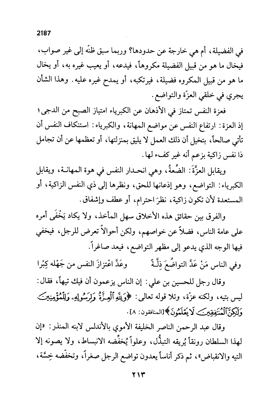 والفرق بين حقائق هذه الأخلاق سهل المأخذ، ولا يكاد يَخْفَى أمره على عامة الناس، فضلاً عن خواصهم، ولكن أحوالاً تعرض للرجل، فيخفي فيها الوجه الذي يدعو إلى مظهر التواضع، فيعد صاغراً.