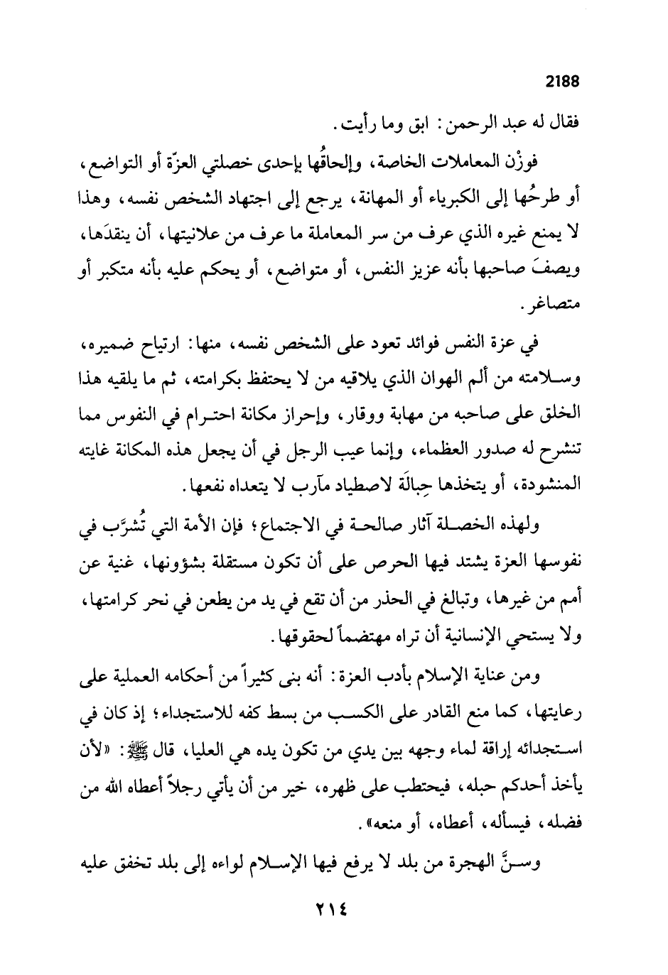 ومن عناية الإِسلام بأدب العزة: أنه بني كثيراً من أحكامه العملية على رعايتها، كما منع القادر على الكسب من بسط كله للاستجداء؛ إذ كان في استجدائه إراقة لماء وجهه بين يدي من تكون يده هي العليا، قال - صلى الله عليه وسلم -: "لأن يأخذ أحدكم حبله، فيحتطب على ظهره، خير من أن يأتي رجلاً أعطاه الله من فضله، فيسأله أعطاه، أو منعه".