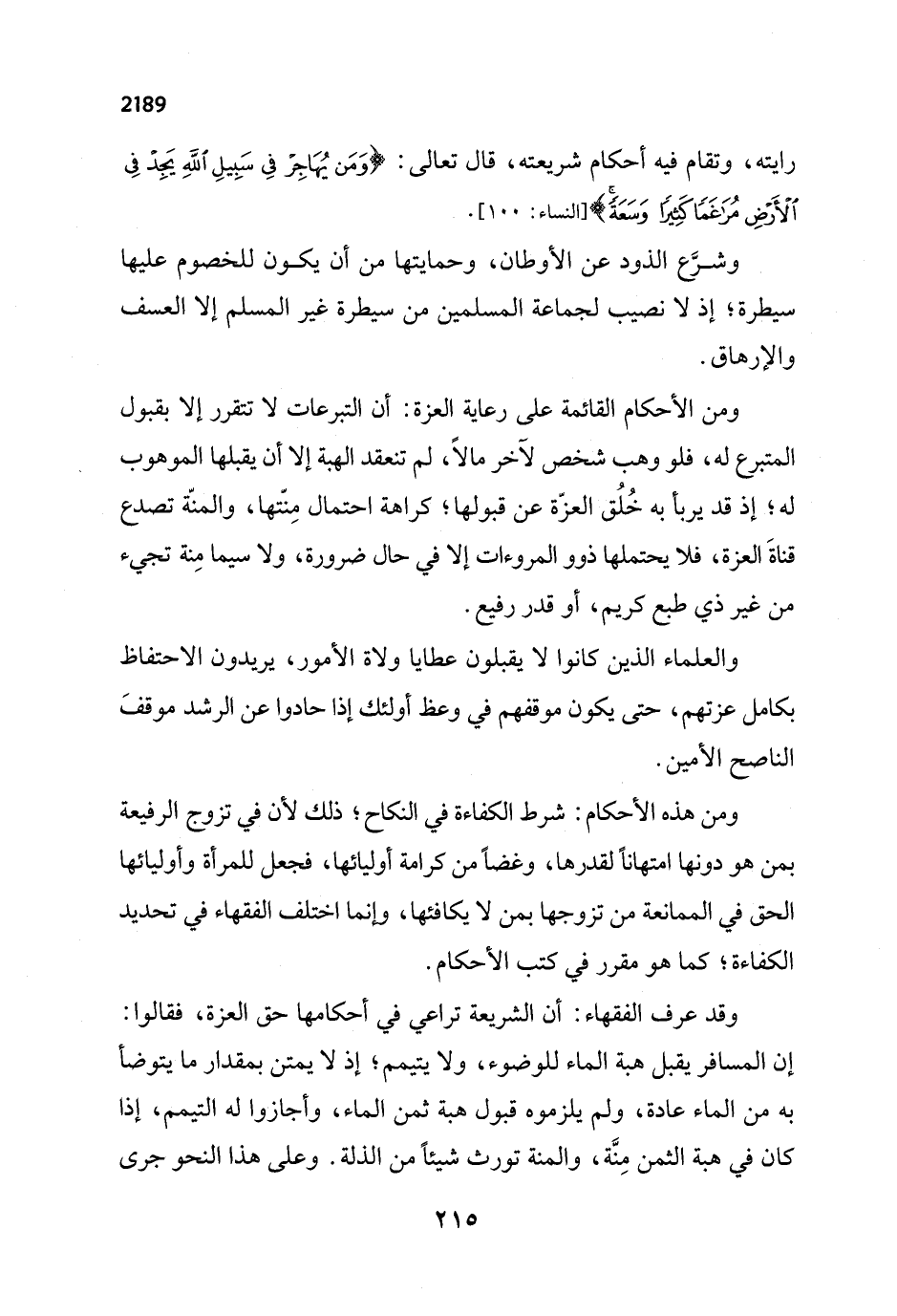 وقد عرف الفقهاء: أن الشريعة تراعي في أحكامها حق العزة، فقالوا: إن المسافر يقبل هبة الماء للوضوء، ولا يتيمم؛ إذ لا يمتن بمقدار ما يتوضأ به من الماء عادة، ولم يلزموه قبول هبة ثمن الماء، وأجازوا له التيمم، إذا كان في هبة الثمن مِنَّة، والمنة تورث شيئاً من الذلة. وعلى هذا النحو جرى