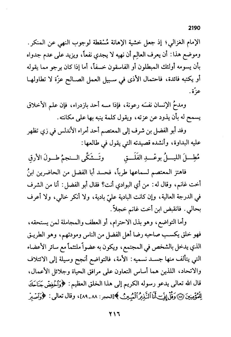 الإمام الغزالي؛ إذ جعل خشية الإهانة مُسْقطة لوجوب النهي عن المنكر. وموضع هذا: أن يعرف العالِم أن نهيه لا يجدي نفعًا، ويزيد على عدم جدواه بأن يسومه أولئك المبطلون أو الفاسقون خسفًا، أما إذا كان يرجو مما يقوله أو يكتبه فائدة، فاحتمال الأذى في سبيل العمل الصالح عزة لا تطاولها عزة.