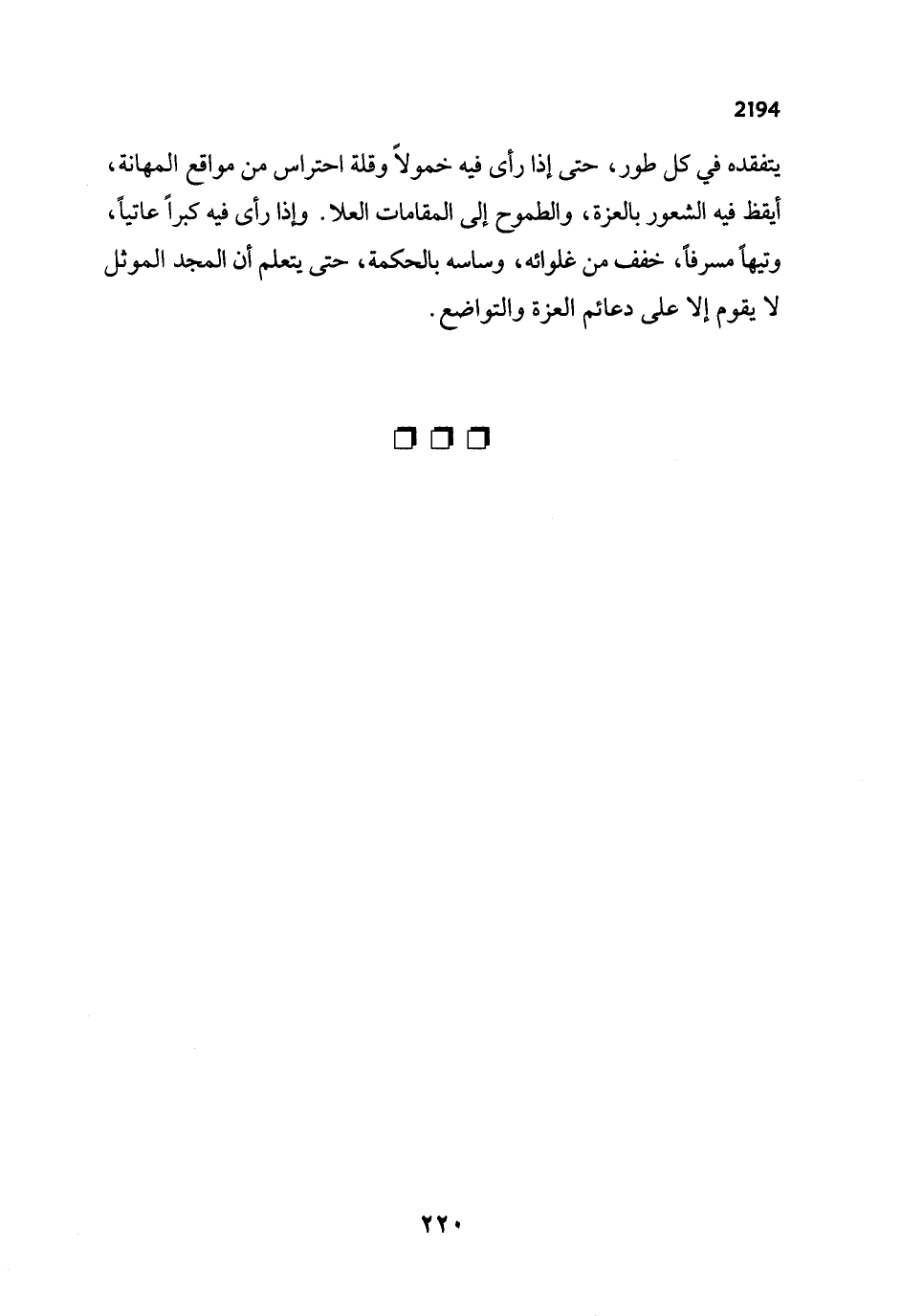 يتفقده في كل طور، حتى إذا رأى فيه خمولاً وقلة احتراس من مواقع المهانة، أيقظ فيه الشعور بالعزة، والطموح إلى المقامات العلا. وإذا رأى فيه كبراً عاتياً، وتيهاً مسرفاً، خفف من غلوائه، وساسه بالحكمة، حتى يتعلم أن المجد الموثل لا يقوم إلا على دعائم العزة والتواضع.