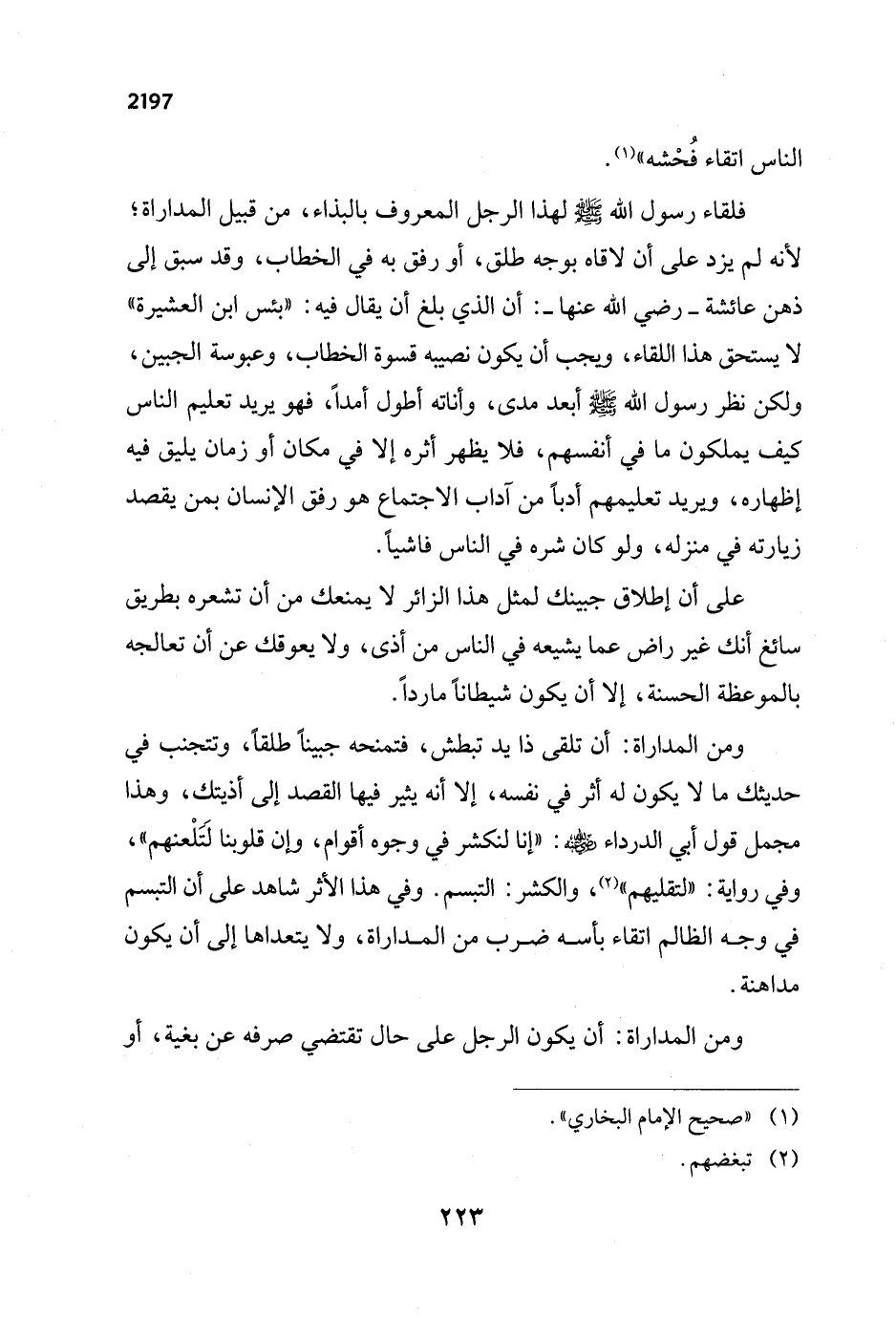 فلقاء رسول الله - صلى الله عليه وسلم - لهذا الرجل المعروف بالبذاء، من قبيل المداراة؛ لأنه لم يزد على أن لاقاه بوجه طلق، أو رفق به في الخطاب، وقد سبق إلى ذهن عائشة - رضي الله عنها -: أن الذي بلغ أن يقال فيه: "بئس ابن العشيرة" لا يستحق هذا اللقاء، ويجب أن يكون نصيبه قسوة الخطاب، وعبوسة الجبين، ولكن نظر رسول الله - صلى الله عليه وسلم - أبعد مدى، وأناته أطول أمدًا، فهو يريد تعليم الناس كيف يملكون ما في أنفسهم، فلا يظهر أثره إلا في مكان أو زمان يليق فيه إظهاره، ويريد تعليمهم أدبا من آداب الاجتماع هو رفق الإنسان بمن يقصد زيارته في منزله، ولو كان شره في الناس فاشياً.