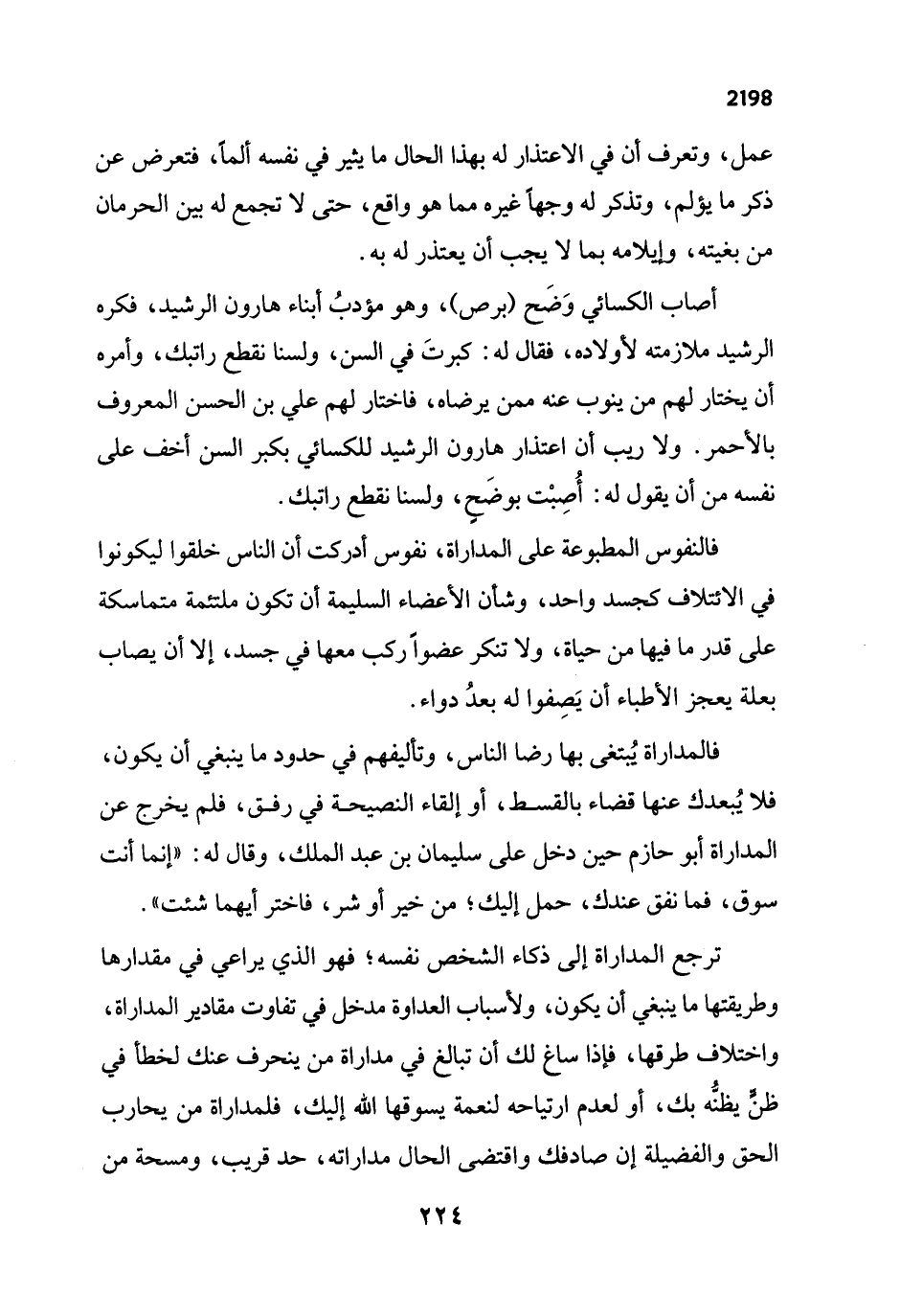 فالنفوس المطبوعة على المداراة، نفوس أدركت أن الناس خلقوا ليكونوا في الائتلاف كجسد واحد، وشأن الأعضاء السليمة أن تكون ملتئمة متماسكة على قدر ما فيها من حياة، ولا تنكر عضوًا ركب معها في جسد، إلا أن يصاب بعلة يعجز الأطباء أن يَصِفوا له بعدُ دواء.