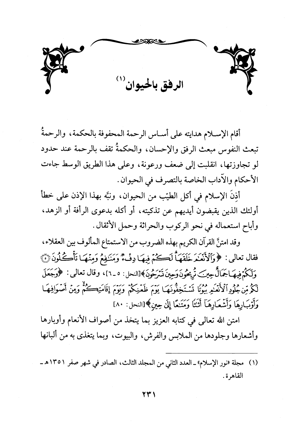 أقام الإِسلام هدايته على أساس الرحمة المحفوفة بالحكمة، والرحمةُ تبعث النفوس مبعث الرفق والإحسان، والحكمةُ تقف بالرحمة عند حدود لو تجاوزتها، انقلبت إلى ضعف ورعونة، وعلى هذا الطريق الوسط جاءت الأحكام والآداب الخاصة بالتصرف في الحيوان.