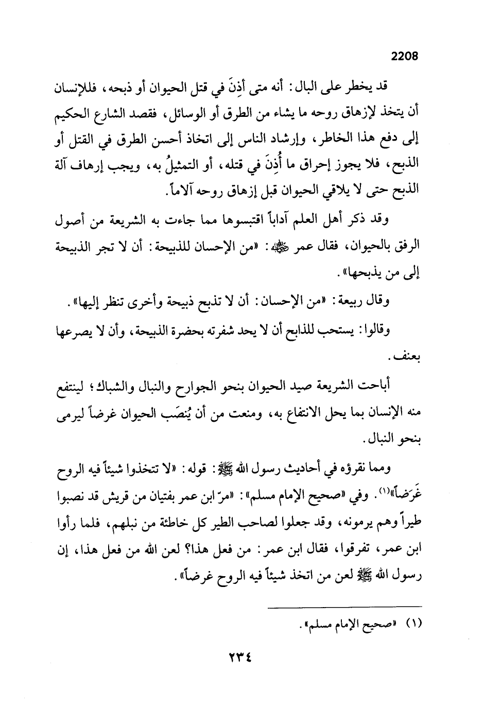 ومما نقرؤه في أحاديث رسول الله - صلى الله عليه وسلم -: قوله: "لا تتخذوا شيئاً فيه الروح غَرَضاً" (¬1). وفي "صحيح الإمام مسلم": "مرّ ابن عمر بفتيان من قريش قد نصبوا طيراً وهم يرمونه، وقد جعلوا لصاحب الطير كل خاطئة من نبلهم، فلما رأوا ابن عمر، تفرقوا، فقال ابن عمر: من فعل هذا؟ لعن الله من فعل هذا، إن رسول الله - صلى الله عليه وسلم - لعن من اتخذ شيئاً فيه الروح غرضاً".