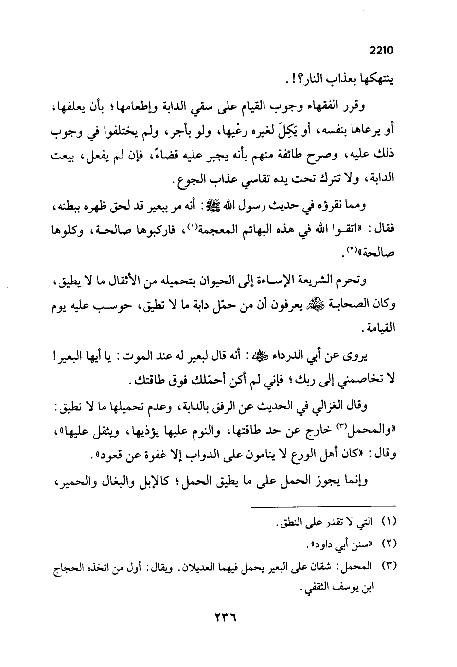 وقال الغزالي في الحديث عن الرفق بالدابة، وعدم تحميلها ما لا تطيق: "والمحمل (¬3) خارج عن حد طاقتها، والنوم عليها يؤذيها، ويثقل عليها"، وقال: "كان أهل الورع لا ينامون على الدواب إلا غفوة عن قعود".