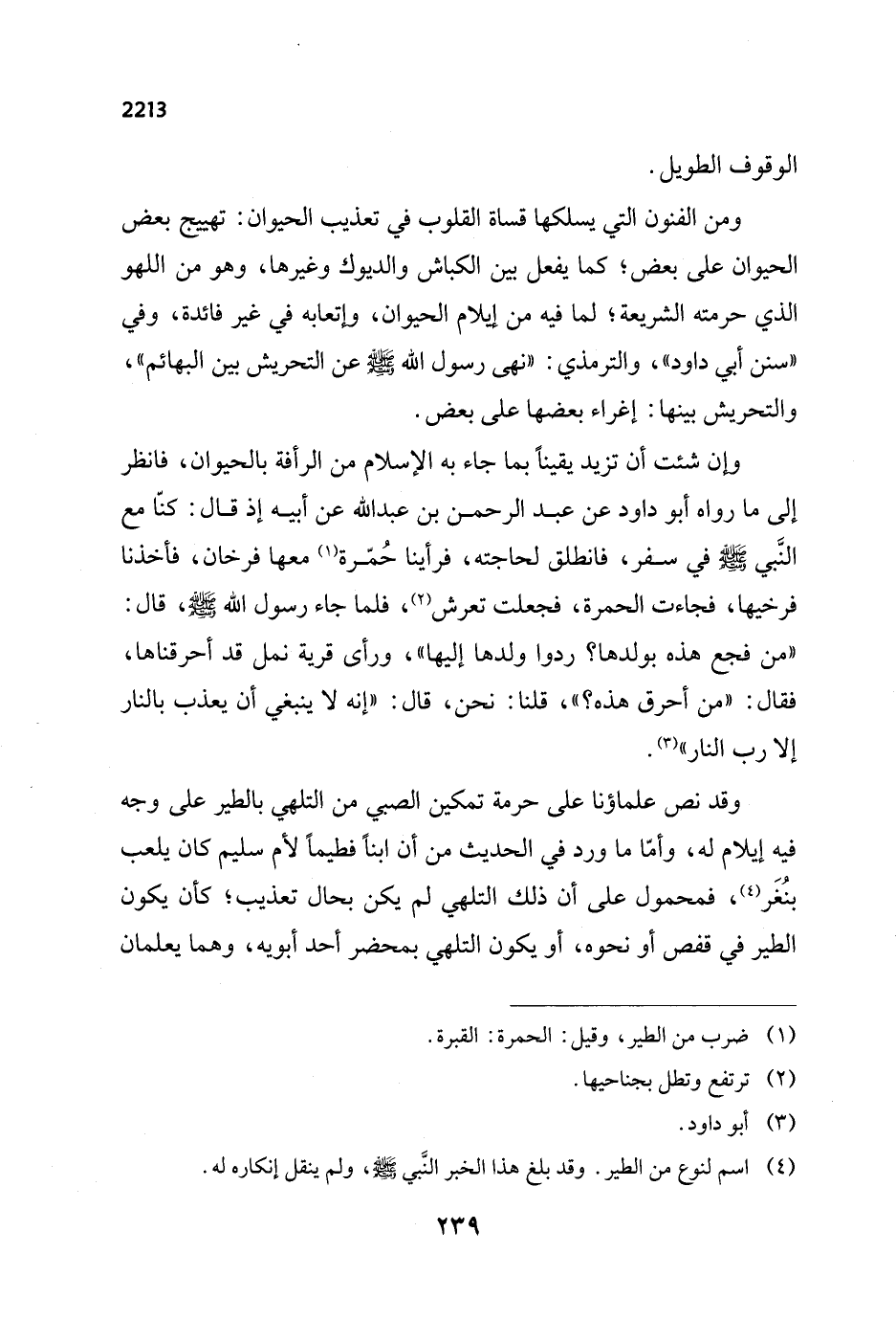 وان شئت أن تزيد يقيناً بما جاء به الإِسلام من الرأفة بالحيوان، فانظر إلى ما رواه أبو داود عن عبد الرحمن بن عبد الله عن أبيه إذ قال: كنّا مع النَّبي - صلى الله عليه وسلم - في سفر، فانطلق لحاجته، فرأينا حُمّرة (¬1) معها فرخان، فأخذنا فرخيها، فجاءت الحمرة، فجعلت تعرش (¬2)، فلما جاء رسول الله - صلى الله عليه وسلم -، قال: "من فجع هذه بولدها؟ ردوا ولدها إليها"، ورأى قرية نمل قد أحرقناها، فقال: "من أحرق هذه؟ "، قلنا: نحن، قال: "إنه لا ينبغي أن يعذب بالنار إلا رب النار" (¬3).
