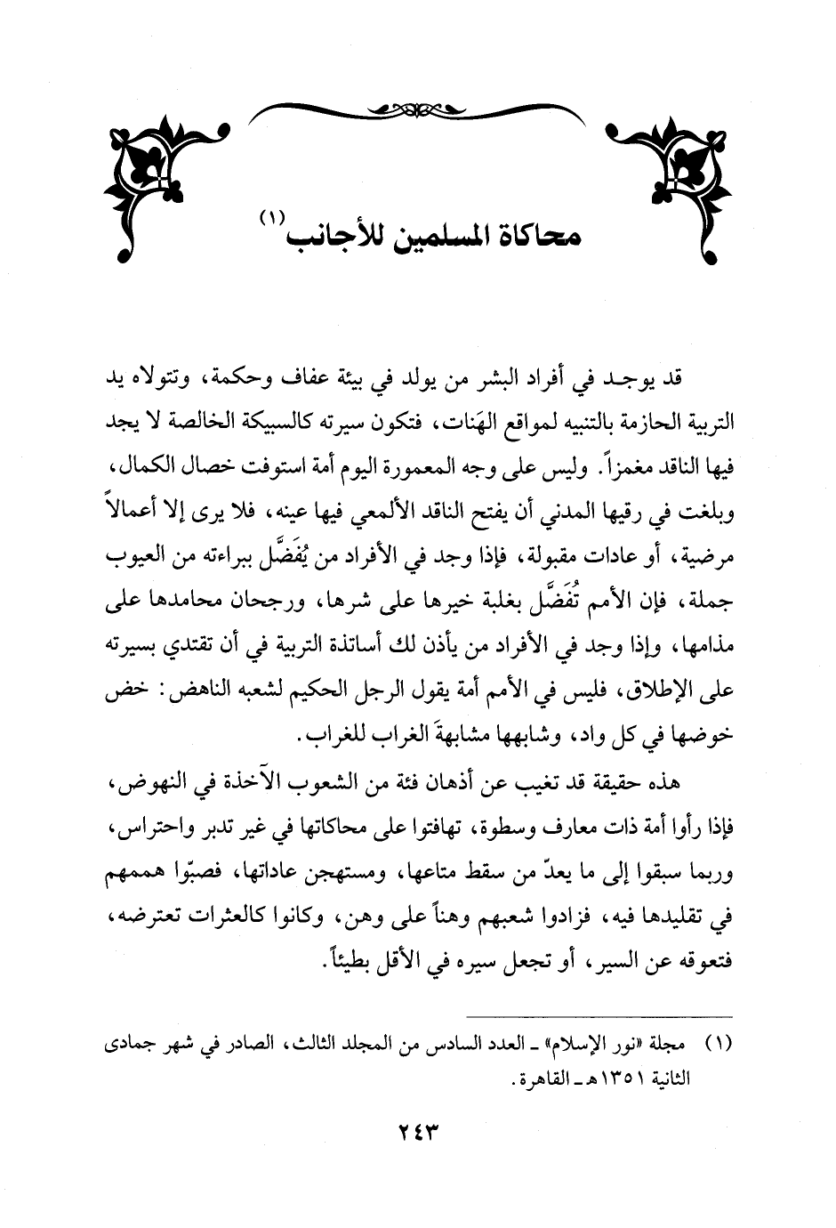 هذه حقيقة قد تغيب عن أذهان فئة من الشعوب الآخذة في النهوض، فإذا رأوا أمة ذات معارف وسطوة، تهافتوا على محاكاتها في غير تدبر واحتراس، وربما سبقوا إلى ما يعدّ من سقط متاعها، ومستهجن عاداتها، فصبّوا هممهم في تقليدها فيه، فزادوا شعبهم وهناً على وهن، وكانوا كالعثرات تعترضه، فتعوقه عن السير، أو تجعل سيره في الأقل بطيئاً.
