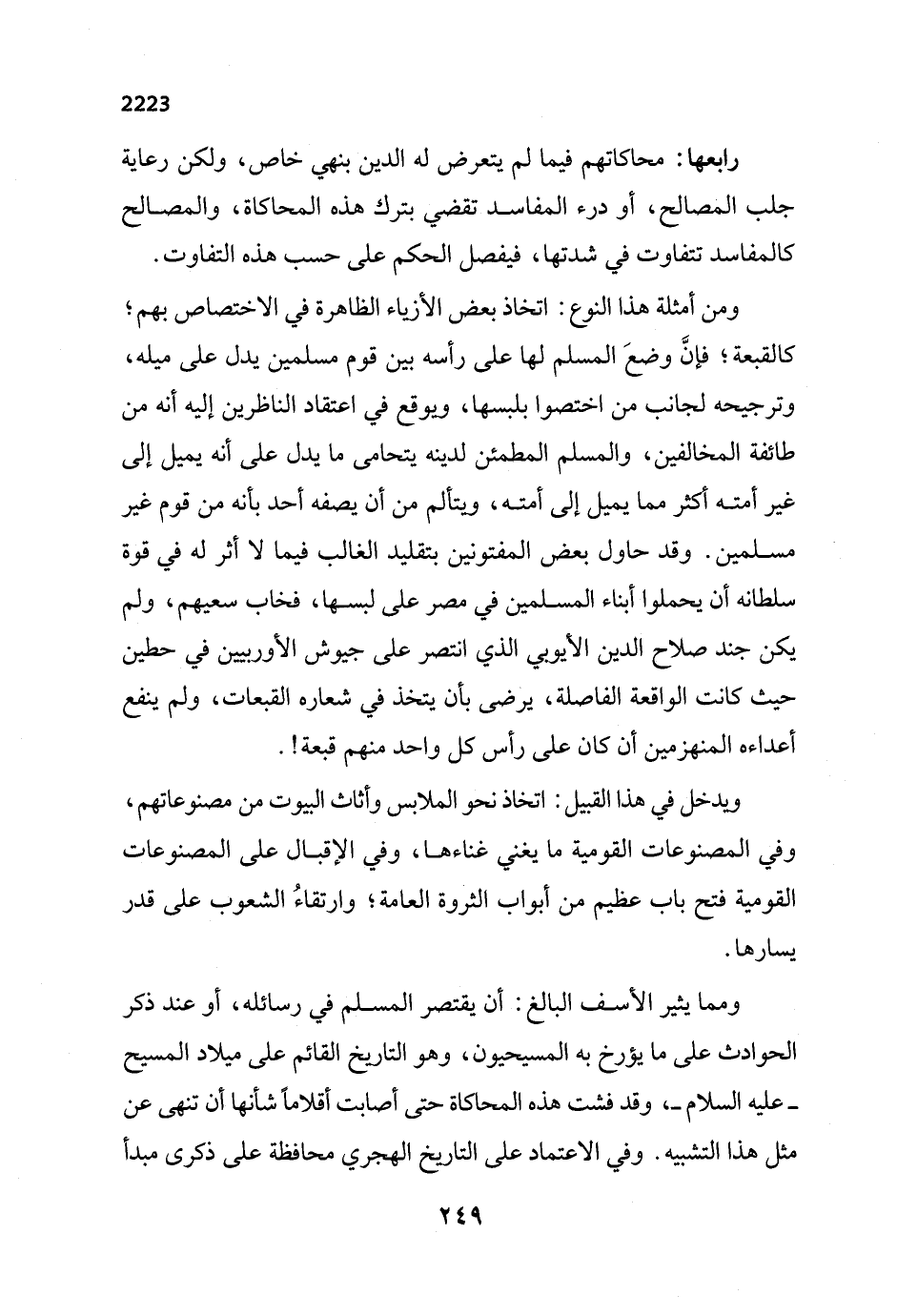 رابعها: محاكاتهم فيما لم يتعرض له الدين بنهي خاص، ولكن رعاية جلب المصالح، أو درء المفاسد تقضي بترك هذه المحاكاة، والمصالح كالمفاسد تتفاوت في شدتها، فيفصل الحكم على حسب هذه التفاوت.
