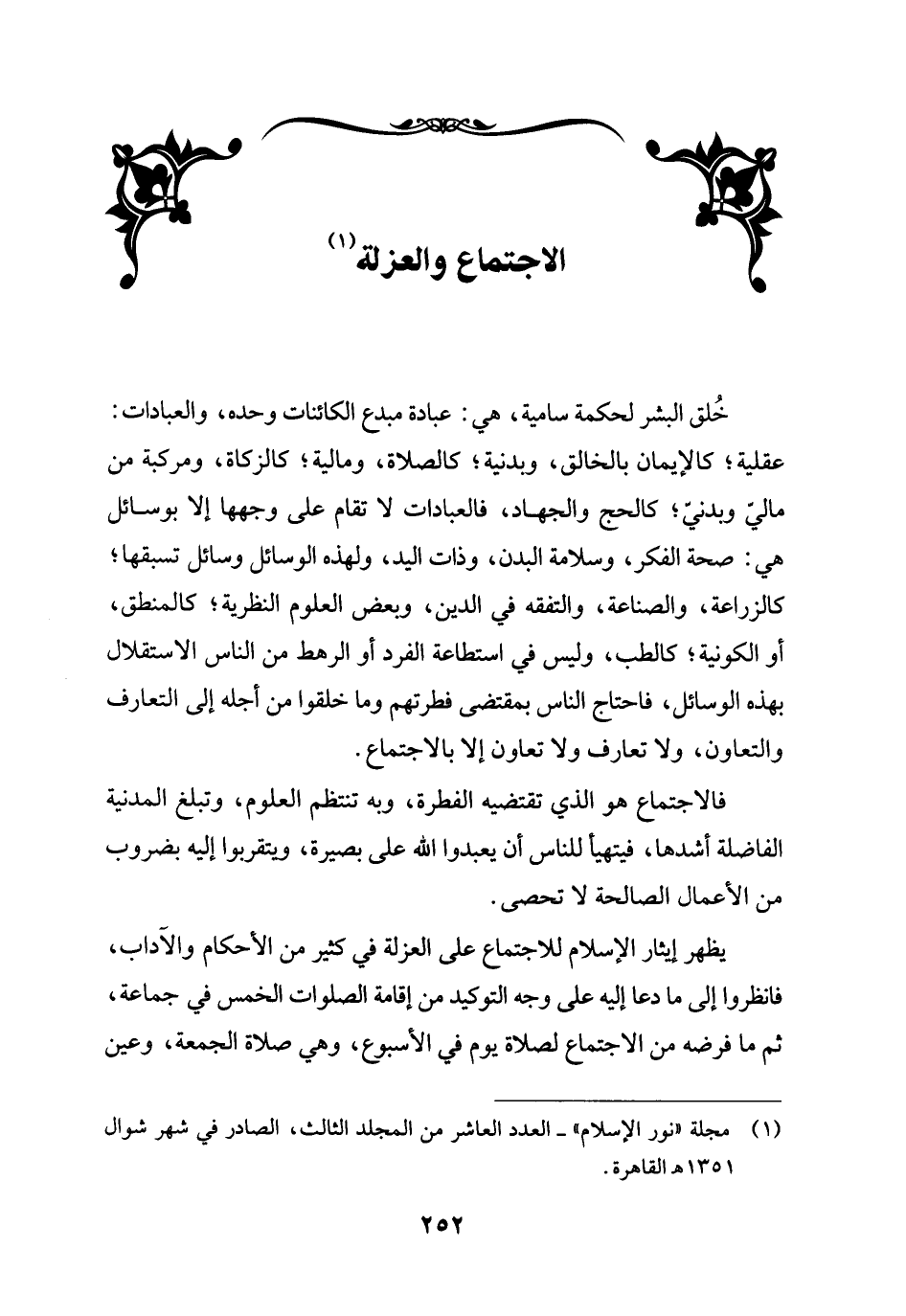 يظهر إيثار الإِسلام للاجتماع على العزلة في كثير من الأحكام والآداب، فانظروا إلى ما دعا إليه على وجه التوكيد من إقامة الصلوات الخمس في جماعة، ثم ما فرضه من الاجتماع لصلاة يوم في الأسبوع، وهي صلاة الجمعة، وعين