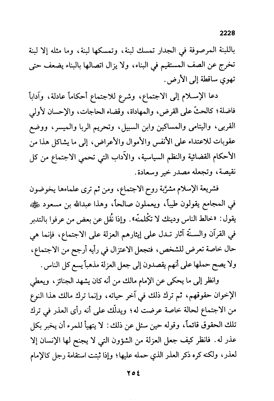 فشريعة الإِسلام مشرَّبة روح الاجتماع، ومن ثم ترى علماءها يخوضون في المجامع يقولون طيباً، ويعملون صالحاً، وهذا عبد الله بن مسعود - رضي الله عنه - يقول: "خالط الناس ودينك لا تكْلمنّه". وإذا نُقل عن بعض من عرفوا بالتدبر في القرآن والسنّة آثار تدل على إيثارهم العزلة على الاجتماع، فإنما هي حال خاصة تعرض للشخص، فتجعل الاعتزال في رأيه أرجح من الاجتماع، ولا يصح حملها على أنهم يقصدون إلى جعل العزلة مذهباً يسع كل الناس.