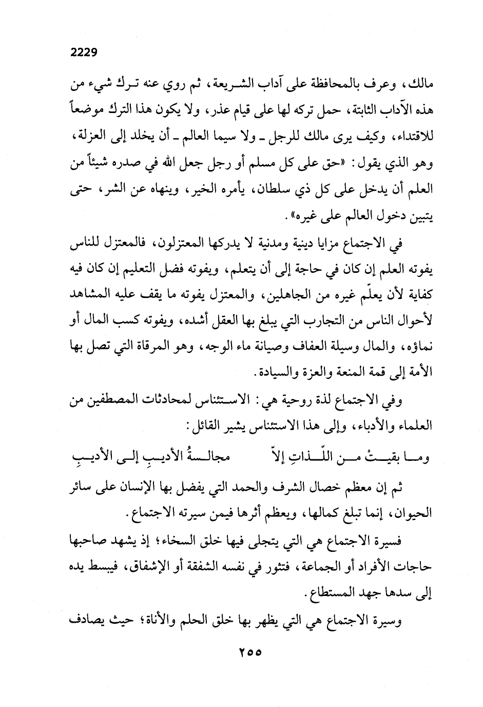 في الاجتماع مزايا دينية ومدنية لا يدركها المعتزلون، فالمعتزل للناس يفوته العلم إن كان في حاجة إلى أن يتعلم، ويفوته فضل التعليم إن كان فيه كفاية لأن يعلّم غيره من الجاهلين، والمعتزل يفوته ما يقف عليه المشاهد لأحوال الناس من التجارب التي يبلغ بها العقل أشده، ويفوته كسب المال أو نماؤه، والمال وسيلة العفاف وصيانة ماء الوجه، وهو المرقاة التي تصل بها الأمة إلى قمة المنعة والعزة والسيادة.
