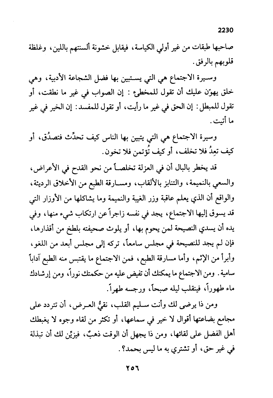 وسيرة الاجتماع هي التي يستبين بها فضل الشجاعة الأدبية، وهي خلق يهوّن عليك أن تقول للمخطئ: إن الصواب في غير ما نطقت، أو تقول للمبطل: إن الحق في غير ما رأيت، أو تقول للمفسد: إن الخير في غير ما أتيت.