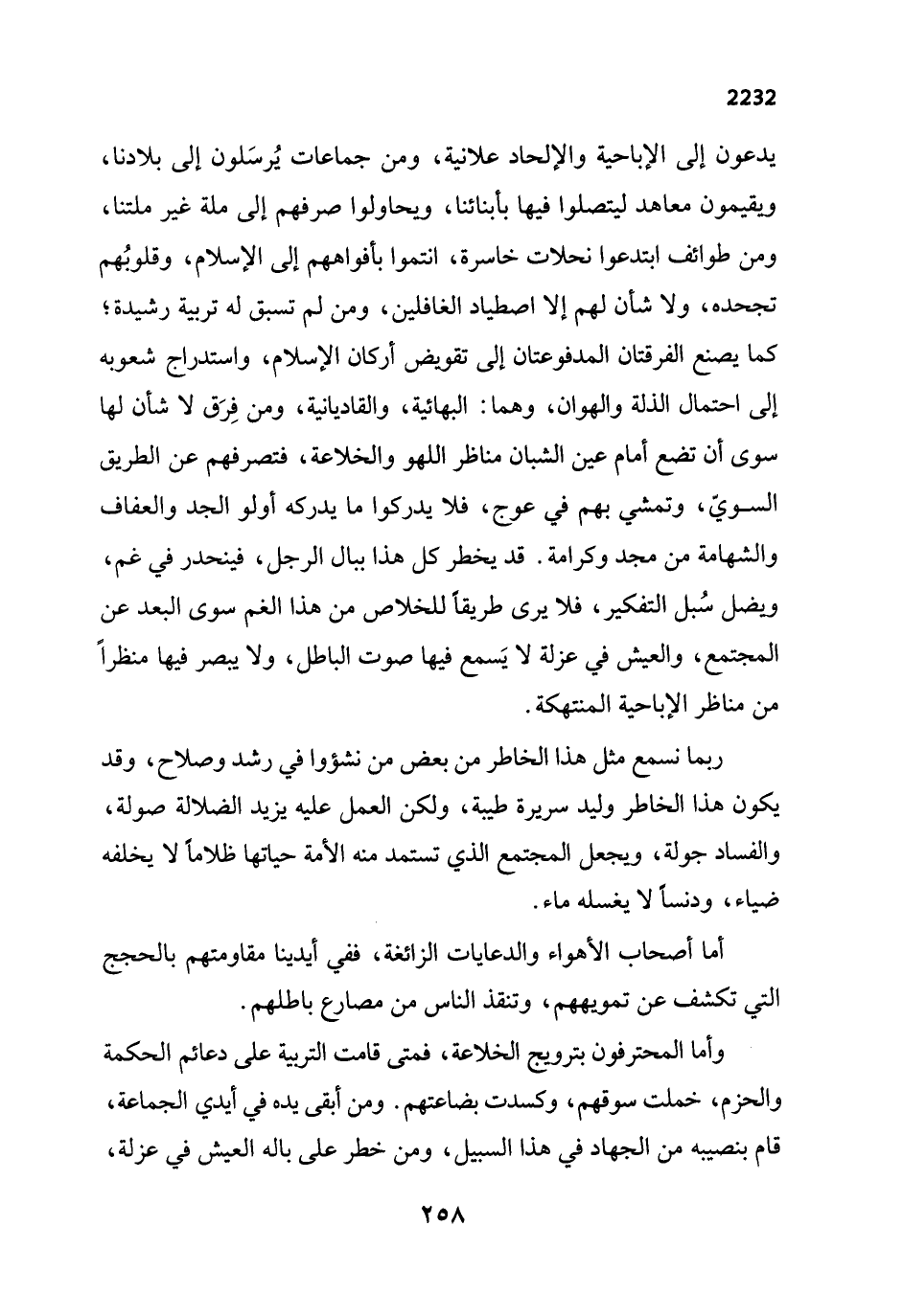 يدعون إلى الإباحية والإلحاد علانية، ومن جماعات يُرسَلون إلى بلادنا، ويقيمون معاهد ليتصلوا فيها بأبنائنا، ويحاولوا صرفهم إلى ملة غير ملتنا، ومن طوائف ابتدعوا نحلات خاسرة، انتموا بأفواههم إلى الإِسلام، وقلوبُهم تجحده، ولا شأن لهم إلا اصطياد الغافلين، ومن لم تسبق له تربية رشيدة؛ كما يصنع الفرقتان المدفوعتان إلى تقويض أركان الإِسلام، واستدراج شعوبه إلى احتمال الذلة والهوان، وهما: البهائية، والقاديانية، ومن فِرَق لا شأن لها سوى أن تضع أمام عين الشبان مناظر اللهو والخلاعة، فتصرفهم عن الطريق السويّ، وتمشي بهم في عوج، فلا يدركوا ما يدركه أولو الجد والعفاف والشهامة من مجد وكرامة. قد يخطر كل هذا ببال الرجل، فينحدر في غم، ويضل سُبل التفكير، فلا يرى طريقاً للخلاص من هذا الغم سوى البعد عن المجتمع، والعيش في عزلة لا يَسمع فيها صوت الباطل، ولا يبصر فيها منظراً من مناظر الإباحية المنتهكة.