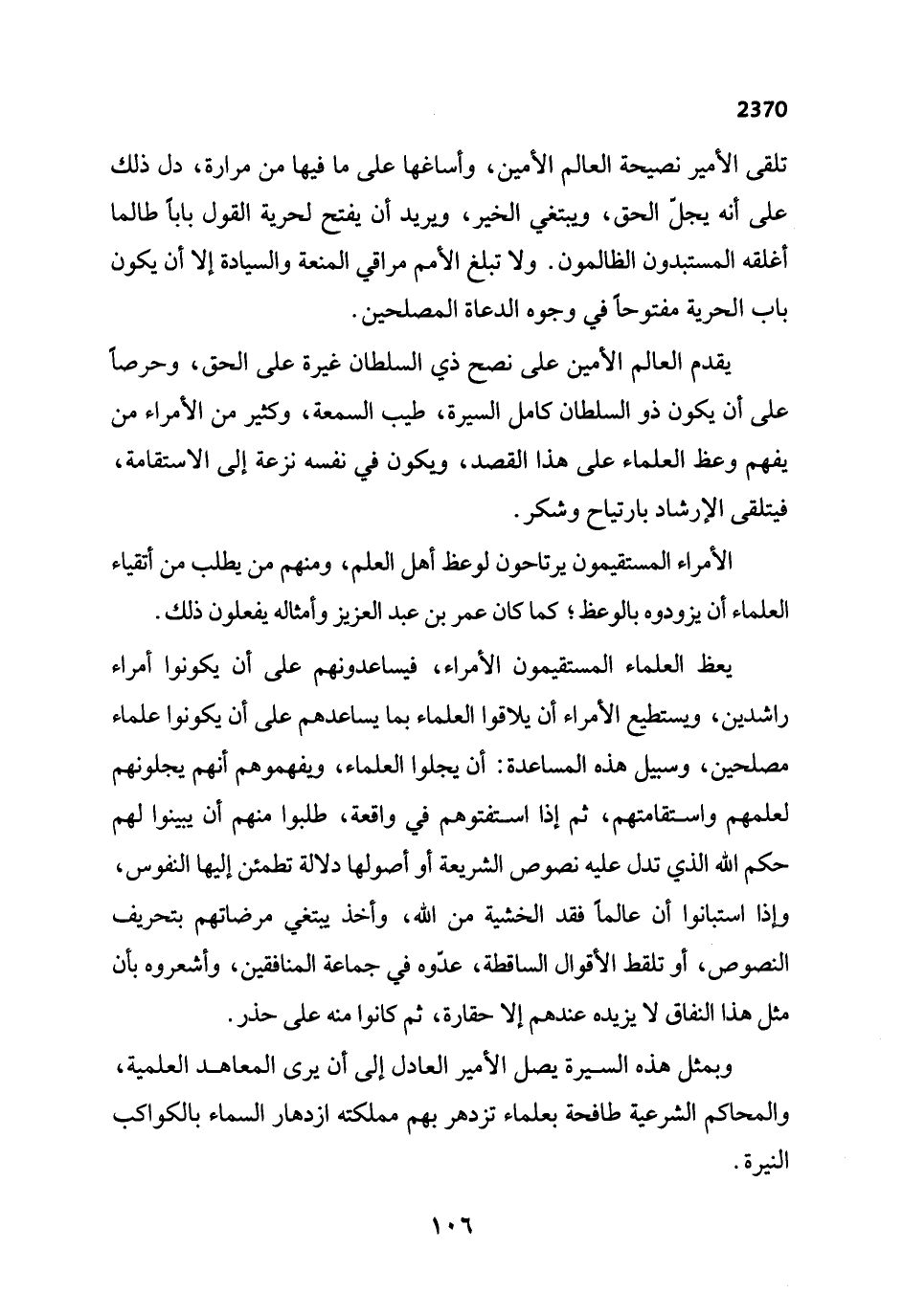 يعظ العلماء المستقيمون الأمراء، فيساعدونهم على أن يكونوا أمراء راشدين، ويستطيع الأمراء أن يلاقوا العلماء بما يساعدهم على أن يكونوا علماء مصلحين، وسبيل هذه المساعدة: أن يجلوا العلماء، ويفهموهم أنهم يجلونهم لعلمهم واستقامتهم، ثم إذا استفتوهم في واقعة، طلبوا منهم أن يبينوا لهم حكم الله الذي تدل عليه نصوص الشريعة أو أصولها دلالة تطمئن إليها النفوس، وإذا استبانوا أن عالماً فقد الخشية من الله، وأخذ يبتغي مرضاتهم بتحريف النصوص، اْو تلقط الأقوال الساقطة، عمّوه في جماعة المنافقين، وأشعروه بأن مثل هذا النفاق لا يزيده عندهم إلا حقارة، ثم كانوا منه على حذر.