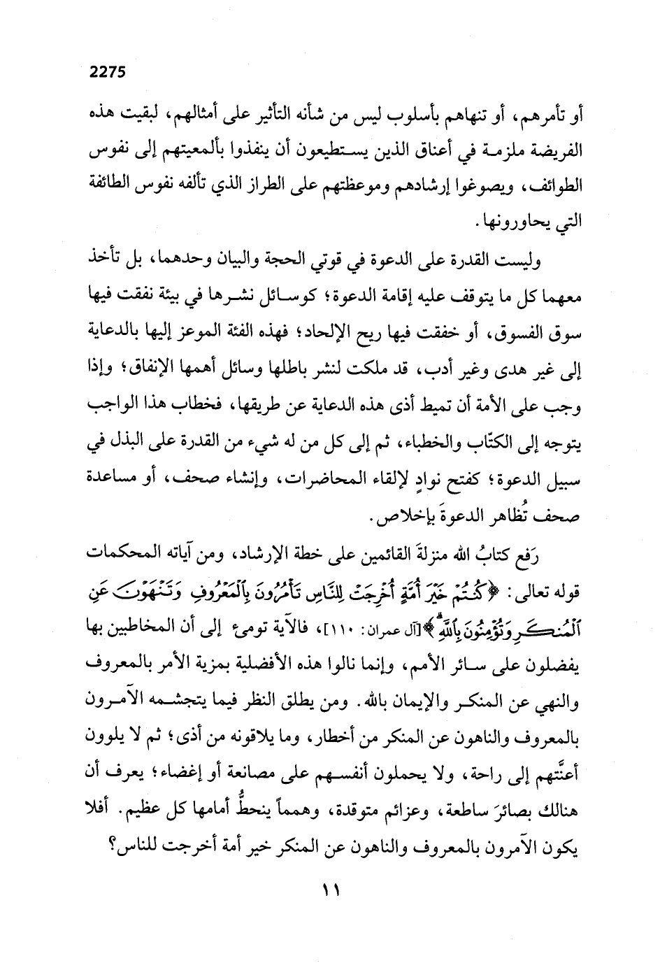 رَفع كتابُ الله منزلةَ القائمين على خطبة الإرشاد، ومن آياته المحكمات قوله تعالى: {كُنْتُمْ خَيْرَ أُمَّةٍ أُخْرِجَتْ لِلنَّاسِ تَأْمُرُونَ بِالْمَعْرُوفِ وَتَنْهَوْنَ عَنِ الْمُنْكَرِ وَتُؤْمِنُونَ بِاللَّهِ} [آل عمران: 110]، فالآية تومئ إلى أن المخاطبين بها يفضلون على سائر الأمم، وإنما نالوا هذه الأفضلية بمزية الأمر بالمعروف والنهي عن المنكر والإيمان بالله. ومن يطلق النظر فيما يتجشمه الآمرون بالمعروف والناهون عن المنكر من أخطار، وما يلاقونه من أذى؛ ثم لا يلوون أعنَّتهم إلى راحة، ولا يحملون أنفسهم على مصانعة أو إغضاء؛ يعرف أن هنالك بصائرَ ساطعة، وعزائم متوقدة، وهمماً ينحطُّ أمامها كل عظيم. أفلا يكون الآمرون بالمعروف والناهون عن المنكر خير أمة أخرجت للناس؟