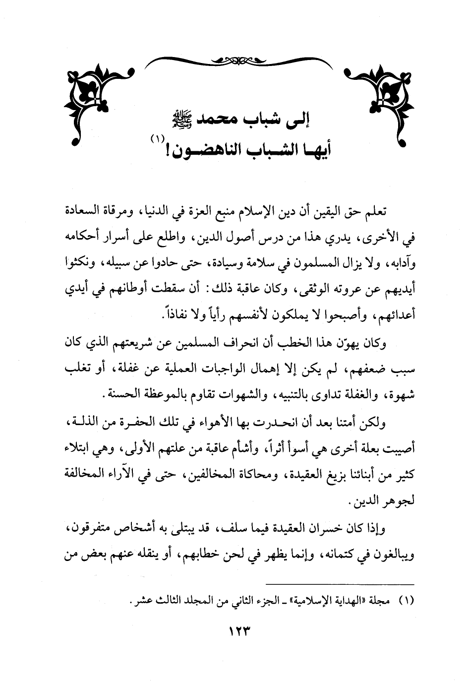 إلى شباب محمد - صلى الله عليه وسلم - أيها الشباب الناهضون! (¬1)