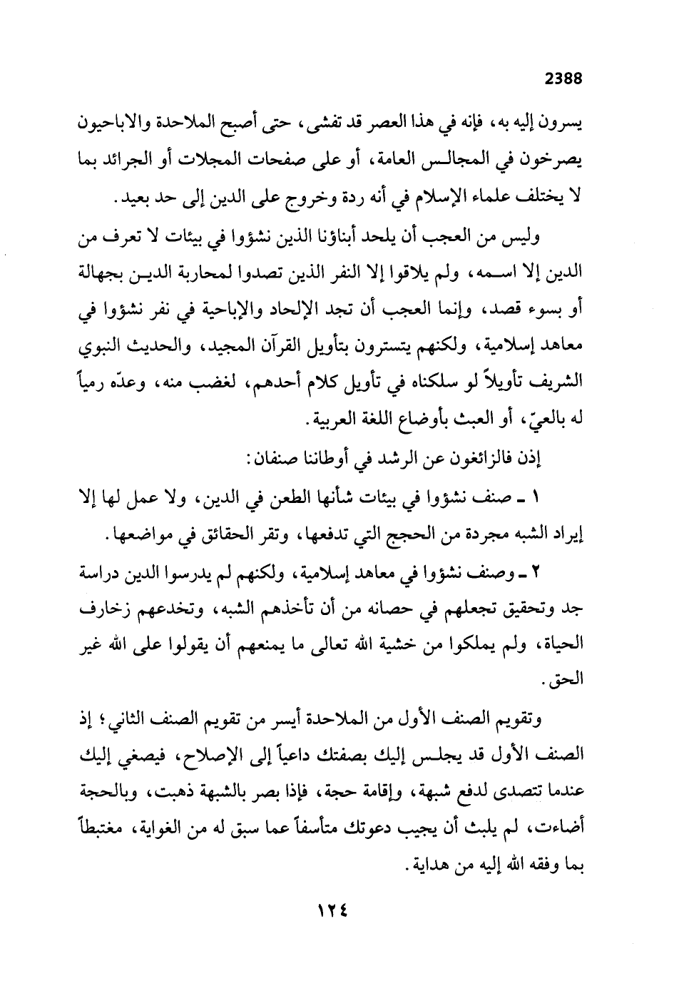 يسرون إليه به، فإنه في هذا العصر قد تفشى، حتى أصبح الملاحدة والاباحيون يصرخون في المجالس العامة، أو على صفحات المجلات أو الجرائد بما لا يختلف علماء الإسلام في أنه ردة وخروج على الدين إلى حد بعيد.