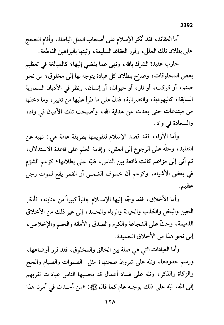 حارب عقيدة الشرك بالله، ونهى عما يفضي إليها؛ كالمبالغة في تعظيم بعض المخلوقات، وصرّح ببطلان كل عبادة يتوجه بها إلى مخلوق؛ من نحو صنم، أو كوكب، أو نار، أو حيوان، أو إنسان، ونظر في الأديان السماوية السابقة؛ كاليهودية، والنصرانية، فدلّ على ما طرأ عليها من تغيير، وما دخلها من مبتدعات حتى بعدت عن هداية الله، وأصبحت تلك الأديان في واد، والسعادة في واد.
