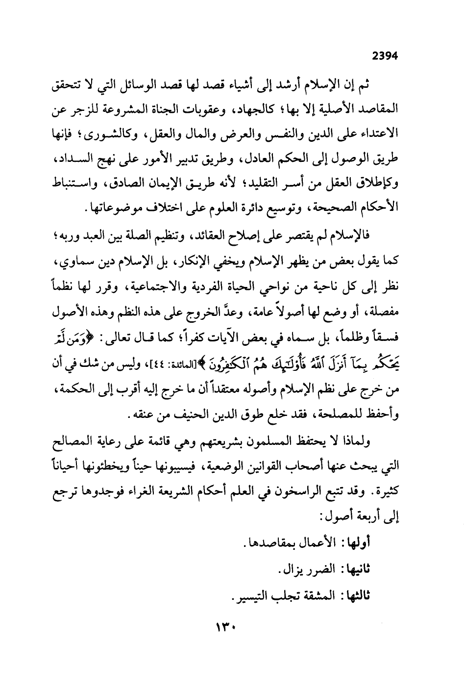 فالإسلام لم يقتصر على إصلاح العقائد، وتنظيم الصلة بين العبد وربه؛ كما يقول بعض من يظهر الاسلام ويخفي الإنكار، بل الإسلام دين سماوي، نظر إلى كل ناحية من نواحي الحياة الفردية والاجتماعية، وقرر لها نظماً مفصلة، أو وضع لها أصولاً عامة، وعدَّ الخروج على هذه النظم وهذه الأصول فسقاً وظلماً، بل سماه في بعض الآيات كفراً؛ كما قال تعالى: {وَمَنْ لَمْ يَحْكُمْ بِمَا أَنْزَلَ اللَّهُ فَأُولَئِكَ هُمُ الْكَافِرُونَ} [المائدة: 44]، وليس من شك في أن من خرج على نظم الإسلام وأصوله معتقداً أن ما خرج إليه أقرب إلى الحكمة، وأحفظ للمصلحة، فقد خلع طوق الدين الحنيف من عنقه.