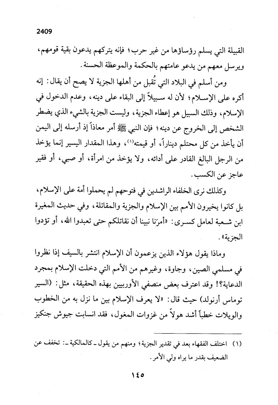 وكذلك نرى الخلفاء الراشدين في فتوحهم لم يحملوا أمة على الإسلام، بل كانوا يخيرون الأمم بين الإسلام والجزية والمقاتلة، وفي حديث المغيرة ابن شعبة لعامل كسرى: "أمرَنا نبينا أن نقاتلكم حتى تعبدوا الله، أو تؤدوا الجزية".