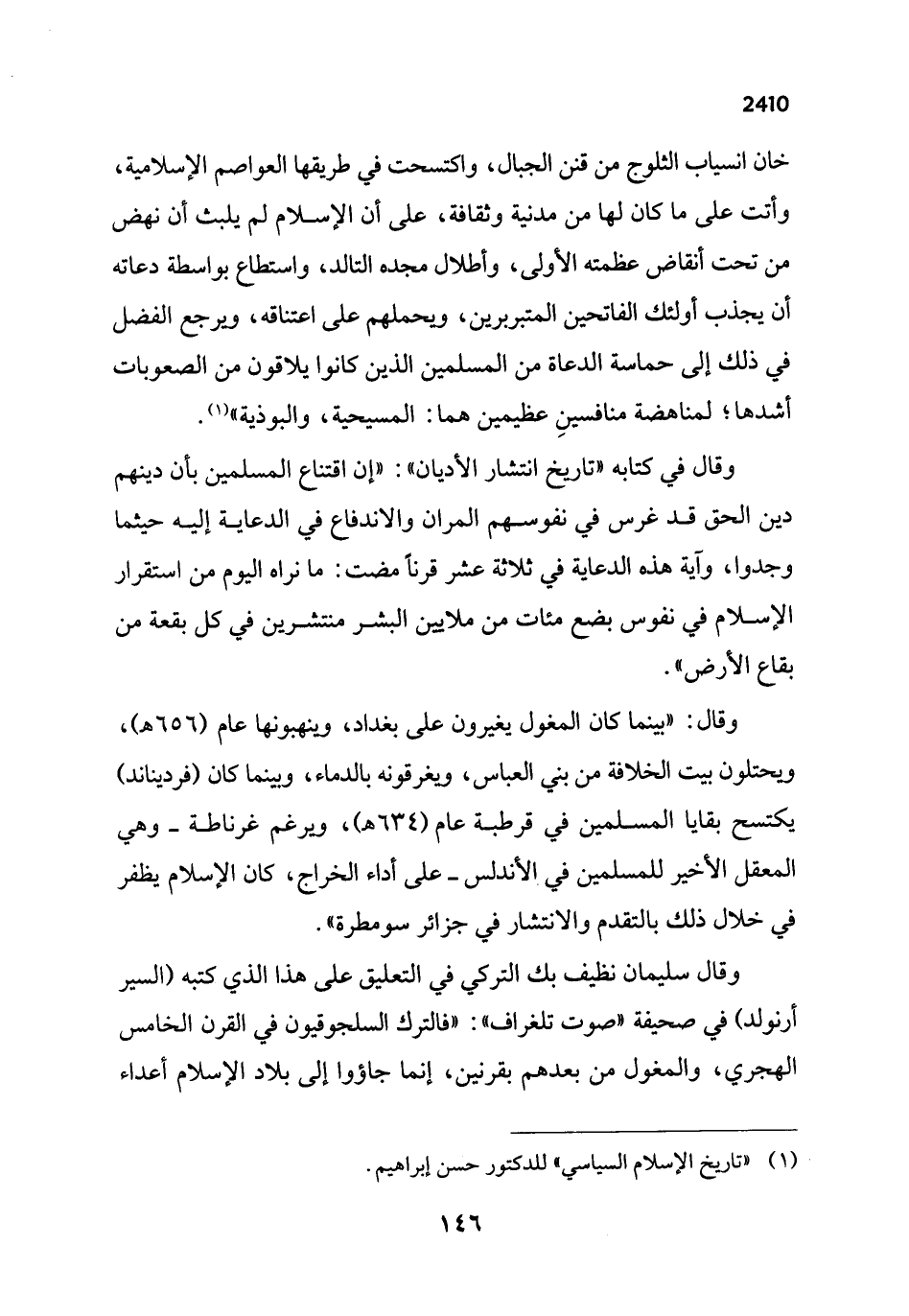 خان انسياب الثلوج من قنن الجبال، واكتسحت في طريقها العواصم الإسلامية، وأتت على ما كان لها من مدنية وثقافة، على أن الإسلام لم يلبث أن نهض من تحت أنقاض عظمته الأولى، وأطلال مجده التالد، واستطاع بواسطة دعاته أن يجذب أولئك الفاتحين المتبربرين، ويحملهم على اعتناقه، ويرجع الفضل في ذلك إلى حماسة الدعاة من المسلمين الذين كانوا يلاقون من الصعوبات أشدها، لمناهضة منافسينِ عظيمين هما: المسيحية، والبوذية" (¬1).