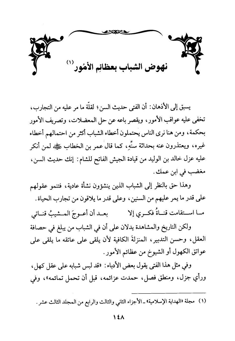 ولكن التاريخ والمشاهدة يدلان على أن في الشباب من يبلغ في حصافة العقل، وحسن التدبير، المنزلةَ الكافية لأن يلقى على عاتقه ما يلقى على عواتق الكهول أو الشيوخ من عظائم الأمور.